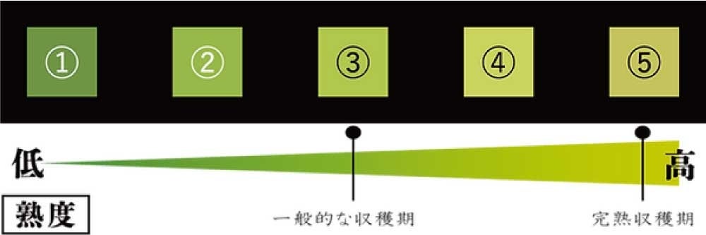 一般的には下記のようなカラーチャート(収穫適期判別カラーチャート/山梨県総合理工学研究機構)などにより、③の色を目安に収穫が行われます。これを超えた④、⑤になると突如として「カスリ」と呼ばれるシミが発現しやすくなり、市場でお客様に手にとっていただくには美味しさは当然のことながら、見栄えも重要視されるためにこれまで敬遠されてきました。ですから農家も③の色を目安に収穫しますし、また完熟がゆえに出荷管理も通常より難しいこともあり一般的に市場に出回らないのです。