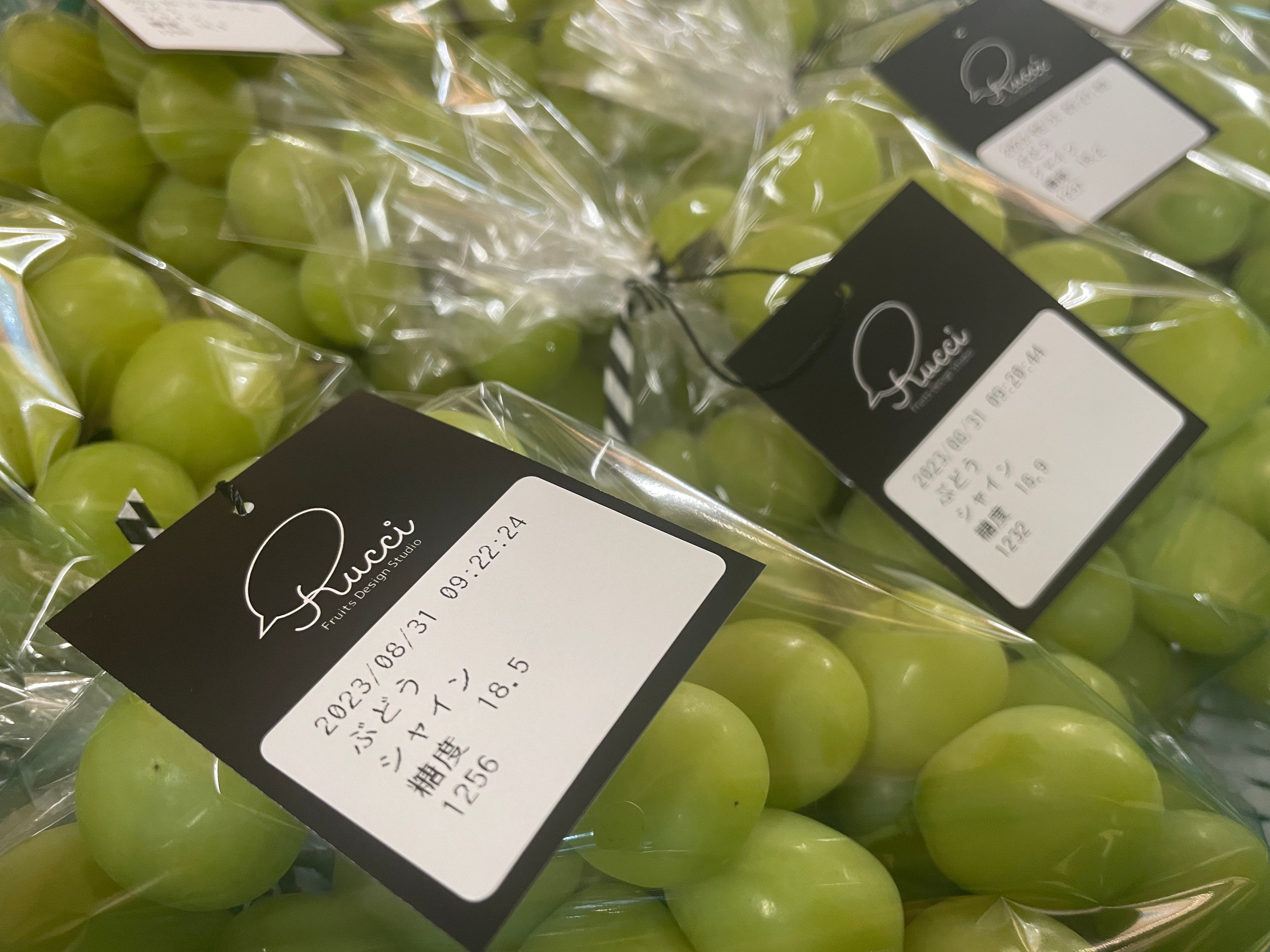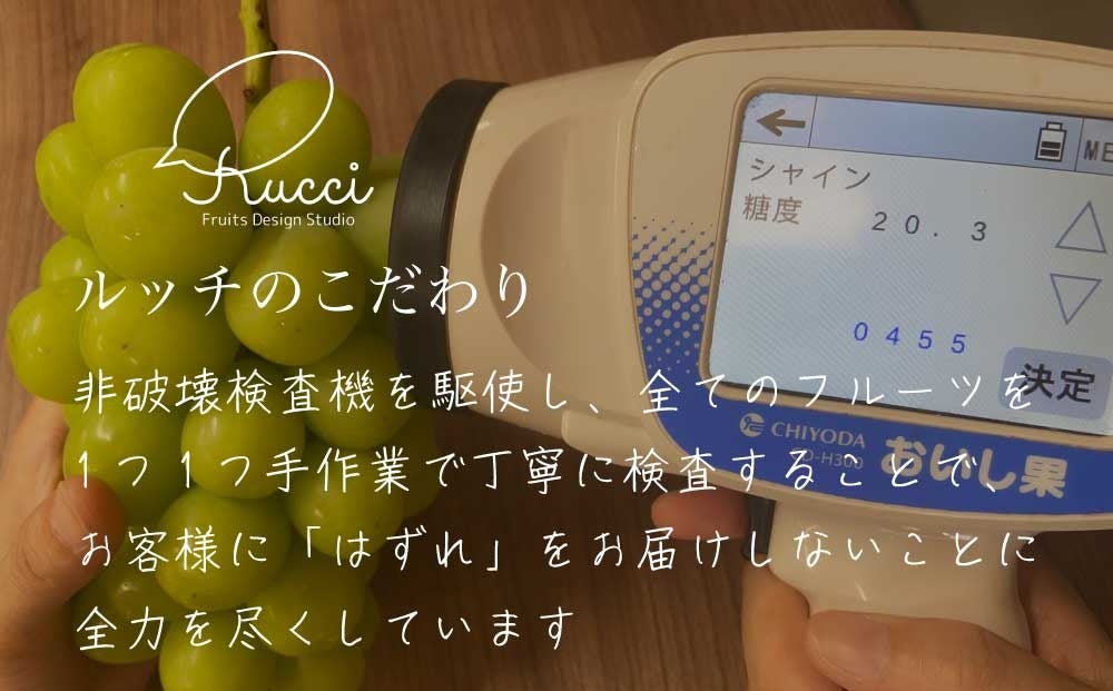 黄色いシャインマスカットに限らず、フルーツの美味しさに紐づく見た目の傾向はあれど絶対はありません。だから、緑のシャインマスカットも桃もキウイフルーツも、私達ルッチフルーツが取り扱うフルーツは全て非破壊検査機器を使って手作業で丹念に糖度検査を行い責任と自信を持ってお客様にお届けしています。その証に、ひとつひとつのフルーツに計測値、計測した日時、通し番号を記した糖度保証タグをお付けしております。