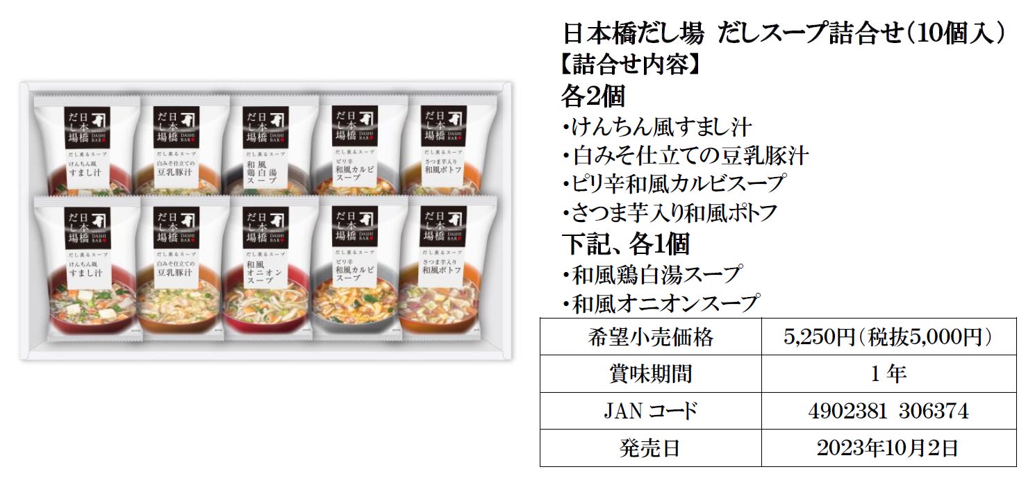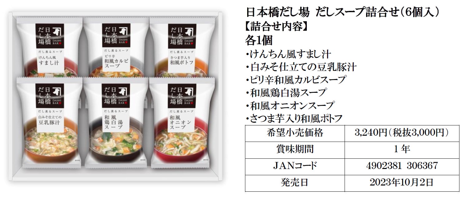 「日本橋だし場 だしスープ」は、「日本橋だし場 本店」で人気のだしスープをベースにしており、素材の食感が楽しめる具だくさんが特長です。フリーズドライのため、お湯を注ぐだけで手軽にかつお節の風味豊かなだしスープをお愉しみいただけます。贈り物にぴったりの詰合せギフトセットを2種類ご用意いたしました。ご家庭用やオフィスでの昼食用に、小腹がすいた時の軽食用に単品でのご購入もおすすめです。