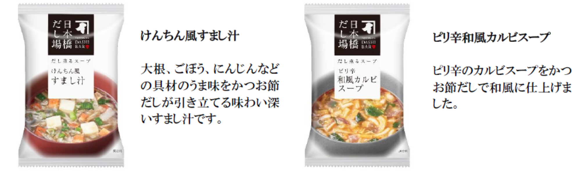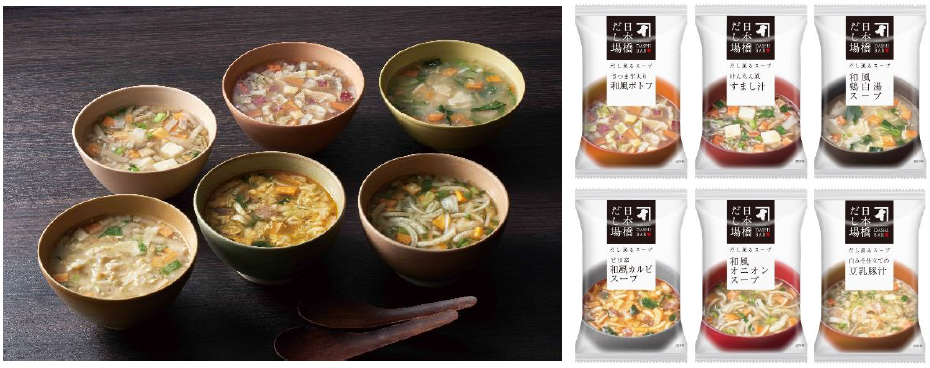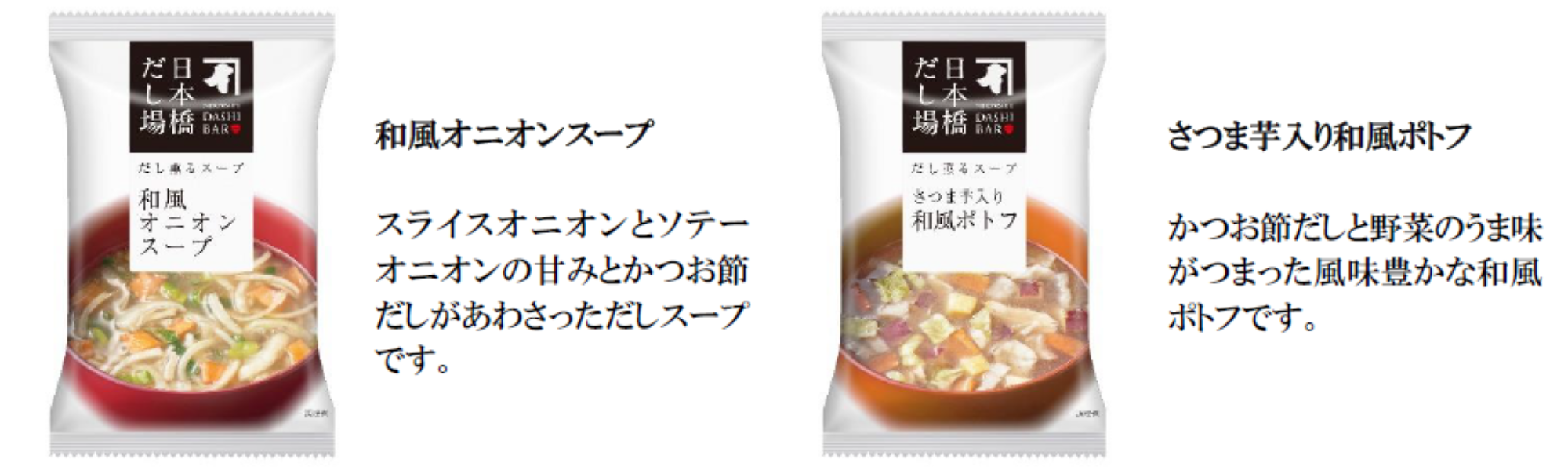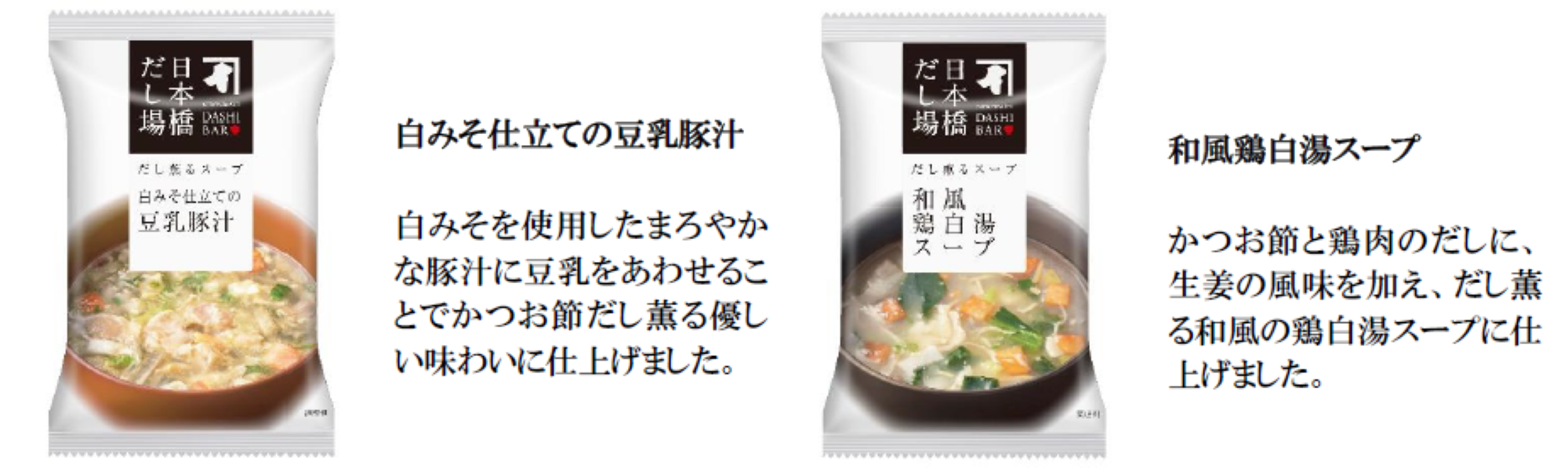 いつでも日本橋だし場の「だしスープ」を味わっていただけるように開発しました。より多くのお客様にご賞味いただけるようにフリーズドライの常温品にしたので、「一汁旬菜 日本橋だし場」などの直営店舗での販売も可能になりました。具だくさんでだし薫るスープをお愉しみください。