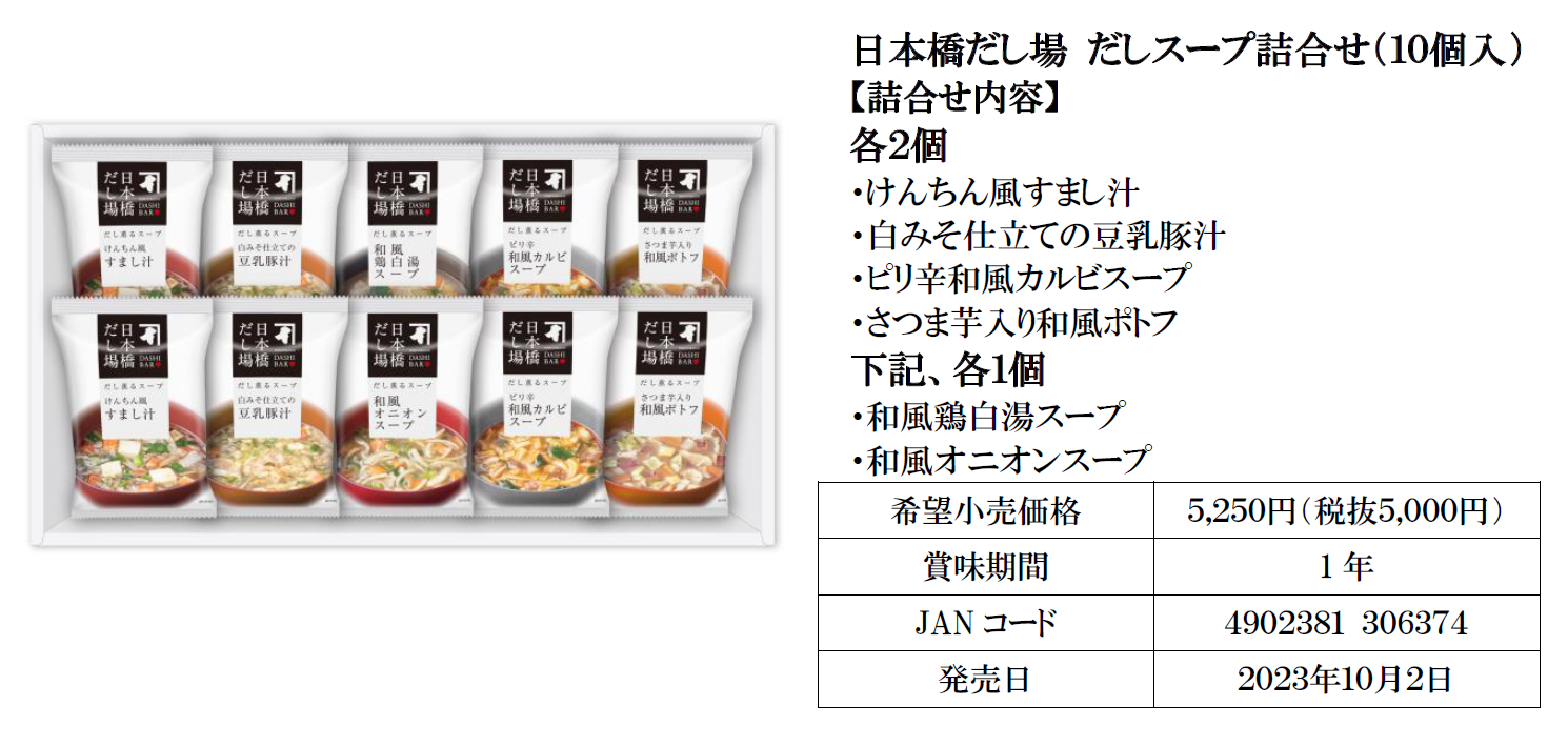 「日本橋だし場 だしスープ」は、「日本橋だし場 本店」で人気のだしスープをベースにしており、素材の食感が楽しめる具だくさんが特長です。フリーズドライのため、お湯を注ぐだけで手軽にかつお節の風味豊かなだしスープをお愉しみいただけます。贈り物にぴったりの詰合せギフトセットを2種類ご用意いたしました。ご家庭用やオフィスでの昼食用に、小腹がすいた時の軽食用に単品でのご購入もおすすめです。