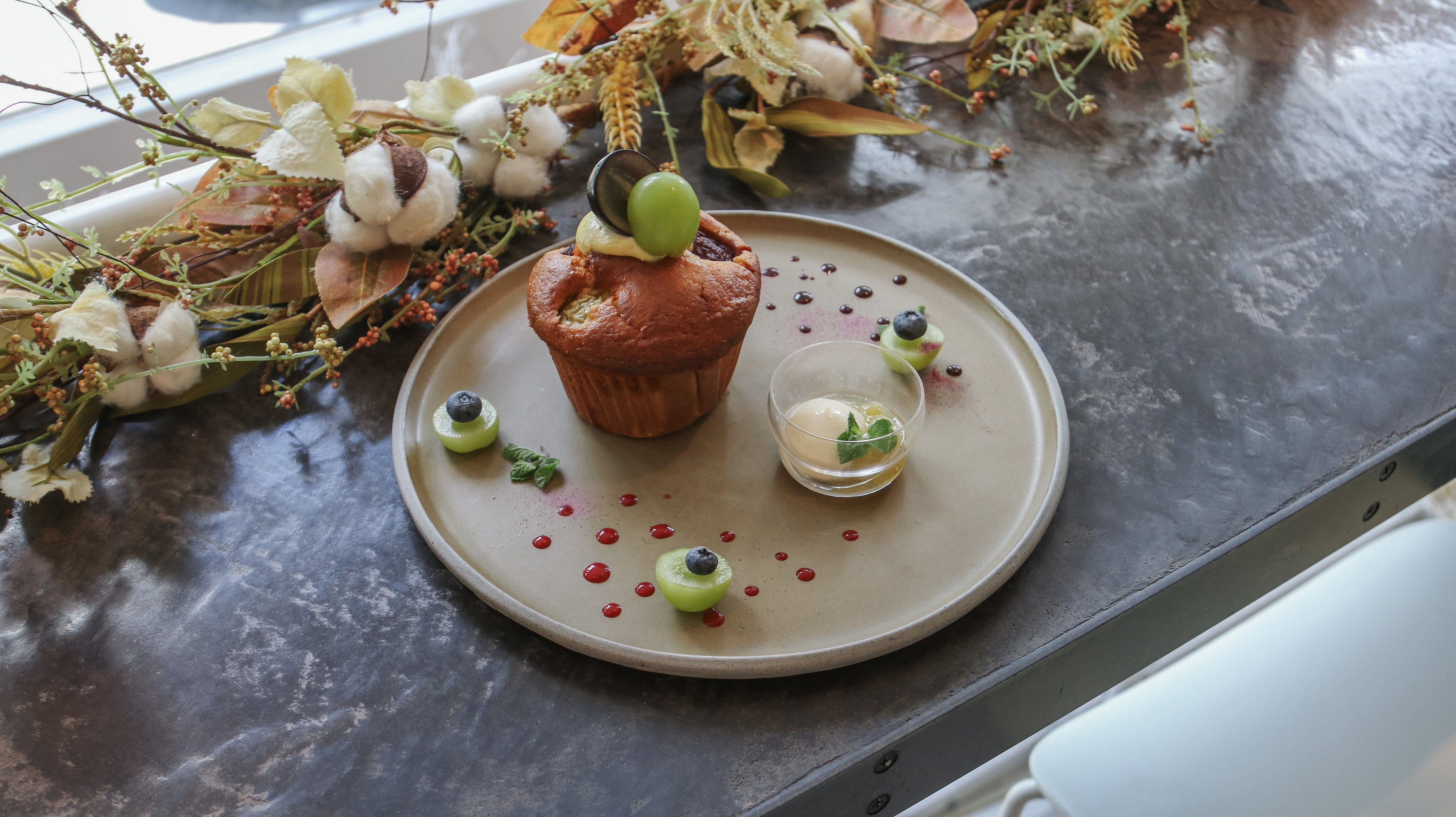 同じく当店こだわりのヴィーガンスイーツとして人気のマフィンは、安心安全な国産有機小麦粉や全粒粉を使用。季節限定味はフレッシュなシャインマスカット、巨峰、ナガノパープルをふんだんに使用。自家製白ブドウジャムと有機豆乳クリームが添えられ、ケーキ仕立てで楽しめます。
