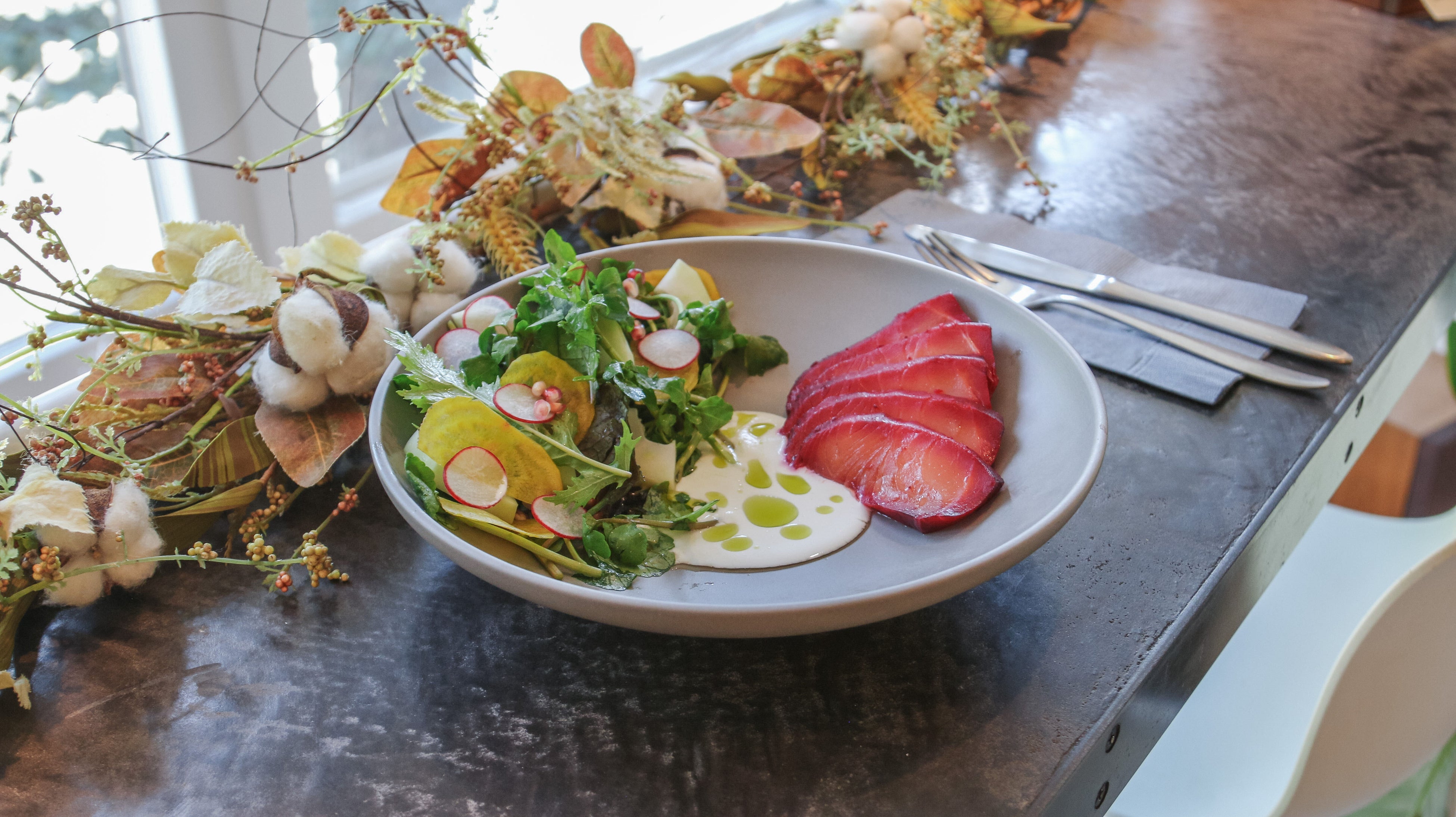2つ目の「スモークサーモンのビューティーサラダボウル」は、マリネしたことで、ビーツの赤が綺麗なグラデーションになったスモークサーモンが特徴的。ブランドスモークサーモンである『讃岐スモークサーモン・燻鮭』を贅沢に味わえる、美容効果の高い食材にこだわったサラダです。食べる美容液との異名を持つサーモンは、栄養豊富でカロリーも低く、美肌やダイエットに効果が期待できます。アンチエイジング効果の高い野菜とフレッシュアロエ、さっぱりとしたギリシャヨーグルトとともに、罪悪感なく召し上がっていただけます。