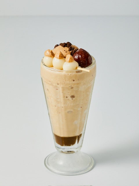 渋皮栗が入ったアイスを使用し、ほうじ茶のパウダーをまぜたことで秋の味覚と香りを楽しむことが出来る、滑らかなシェイクに仕上げています。 お月見をイメージしたお団子とマロンクリーム、渋皮をまとった栗をトッピングして、ほうじ茶の香ばしさと渋皮栗の上品な甘さを感じられるシェイク。
