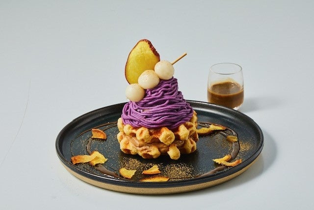 紫芋を使用したクリームとアイスを使用しており、濃厚なおいもの甘みを楽しめます。ワッフルの間にはマロンクリームが入っており、きび砂糖を使用した自家製ほうじ茶シロップをかけると香ばしい香りがプラスされ、より秋を感じられる一品。