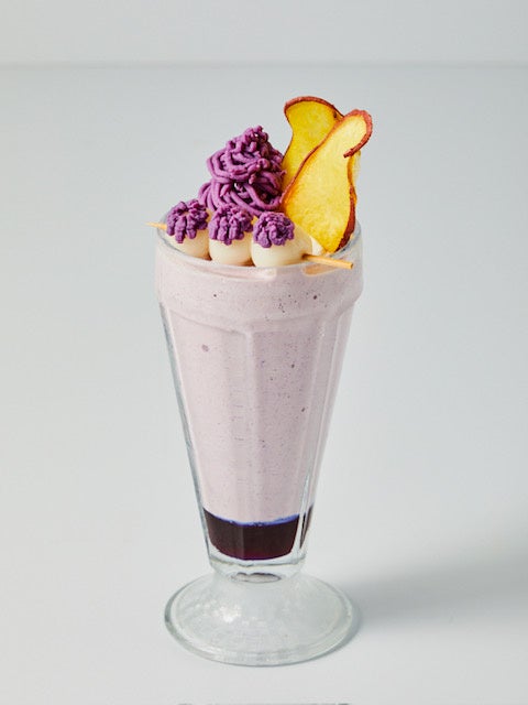 濃厚で甘みのある紫芋を使用したアイスをシェイクにすることで、より一層深みとコクを引き出し、豊かな風味が口いっぱいに広がります。お月見をイメージしたお団子とモンブランに見立てたクリーム、さつまいもチップスをトッピングし、一杯でお芋を存分に感じられるシェイク。