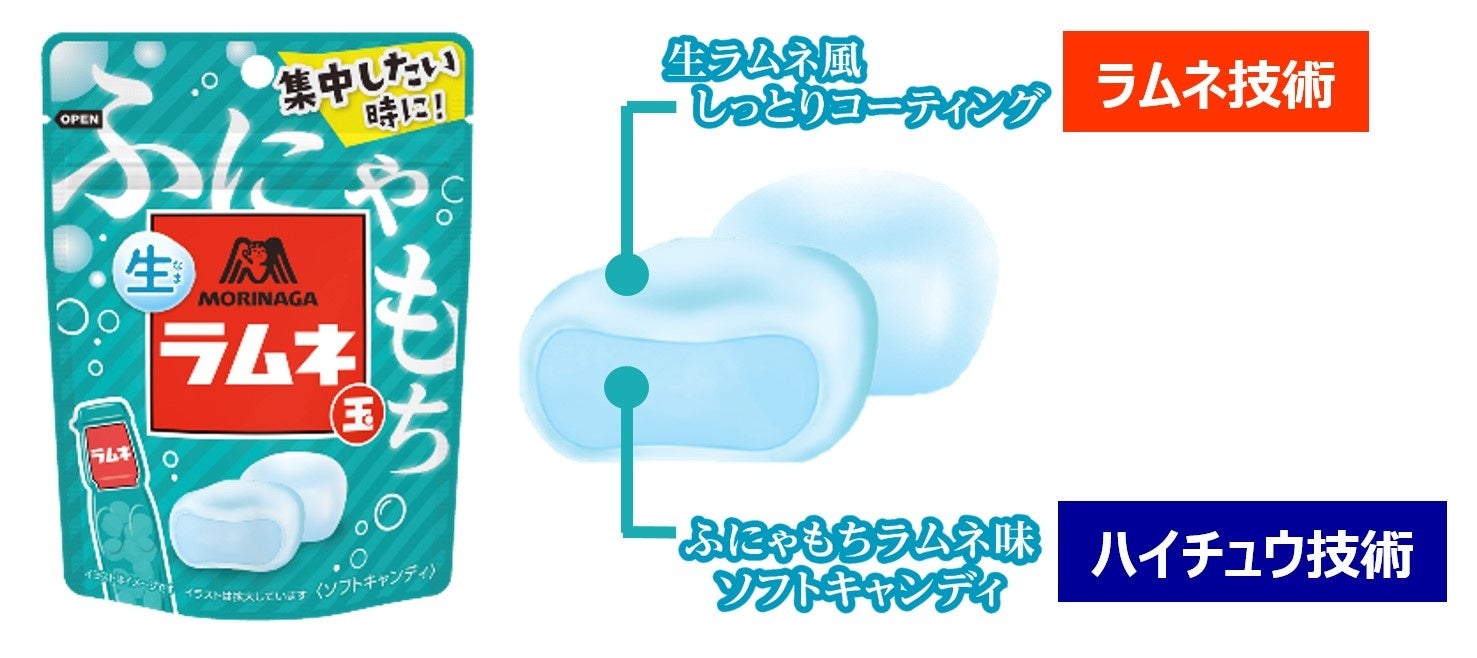・ふにゃもち食感のラムネ味のソフトキャンディ(ハイチュウ技術)を、生ラムネ風のしっとりした糖衣(ラムネ技術)でコーティングしました。