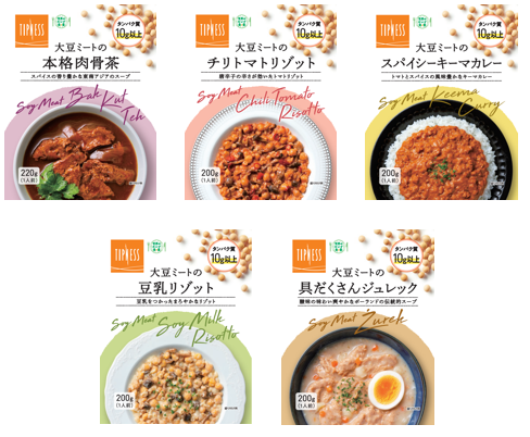 亀田製菓グループの大豆ミートは、水分を多く含む料理でも食感がしっかり保たれて食べごたえがあり、独特の大豆臭も少なく、料理のおいしさを引き立てます。その大豆ミートを使って各国の家庭料理を本格的に再現し、「おいしさ」と「手軽さ」を兼ね備えたレトルト食品シリーズ「世界のだいず食堂」が完成しました。今回はその第1弾として、マレーシアの肉骨茶(バクテー)、ポーランドのジュレック、インドのキーマカレー、イタリアの豆乳リゾット、同じくイタリアのチリトマトリゾットの計5種類について、クラウドファンディングサービスMakuakeにて、9月5日(火)より受注予約を開始します。