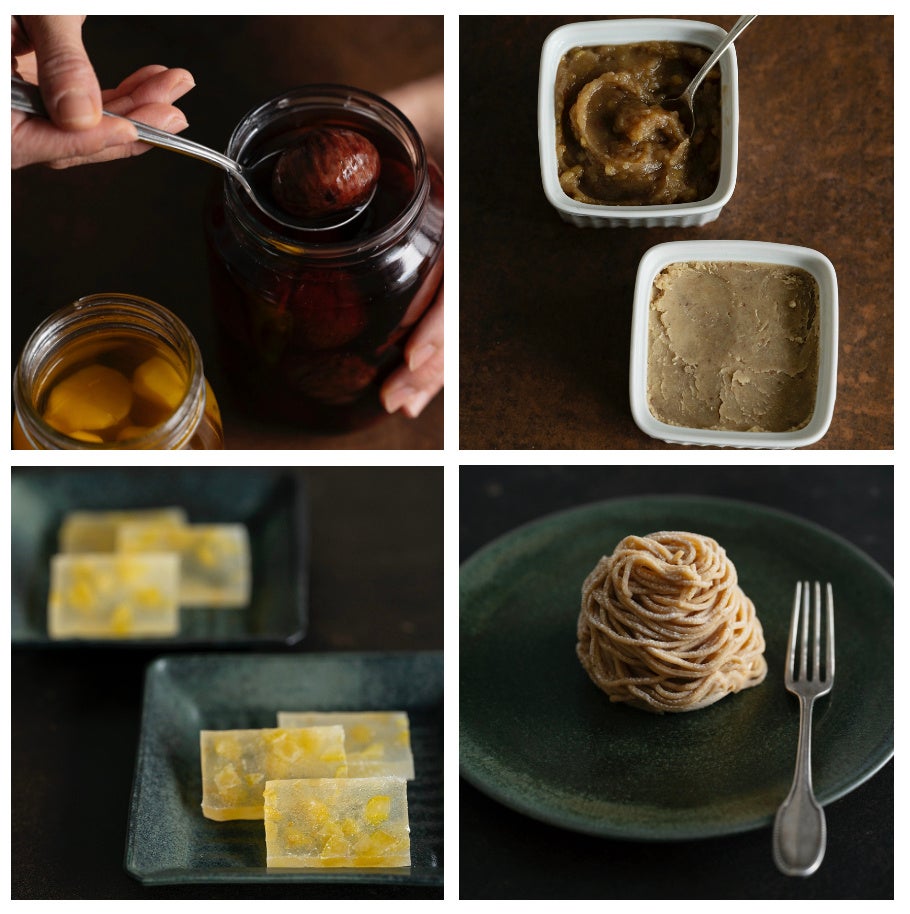 (左上から時計回りに)栗しごとの定番「栗の渋皮煮」「栗の甘露煮」。栗の渋皮煮から作れる和洋菓子は13種類、甘露煮から作れる和洋菓子は10種類掲載。トーストやサンドイッチ、タルティーヌなど、お菓子に展開せず気軽に楽しめる「栗ジャム&栗バター」。和三盆糖を使ったメレンゲに、和栗のペーストを絞った栗の洋菓子の王様「栗と和三盆糖のモンブラン」。栗の甘露煮をシャリシャリ食感の寒天に閉じ込めた和菓子「栗の琥珀糖」。