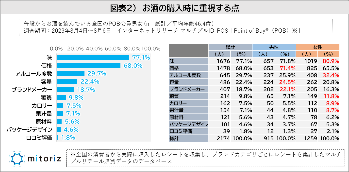 お酒を購入する際に重視する点、男性は「価格」「容量」、女性は「味」「アルコール度数」「糖質」