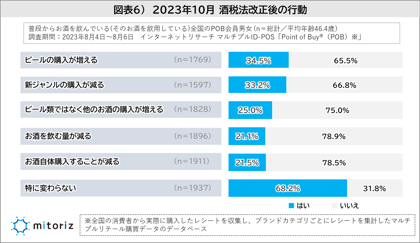2023年10月の酒税法改正によりビールは減税、安さが魅力の新ジャンルは増税により発泡酒と同じ税額になるなど変化が生じます。酒税法改正を踏まえ、飲酒に関する考えを尋ねると「ビールの購入が増える」「新ジャンルの購入が減る」はともに約3割という結果となり、ビール類の中で切り替えが起こる可能性が見込まれます。「ビール類ではなく他のお酒の購入が増える(25.0%)」も4人に1人が回答しており、また、2割の人が「お酒を飲む量が減る(21.1%)」「お酒自体購入することは減る(21.5%)」と購入機会の減少について回答しており、酒類市場への影響は小さくないことが予想されます(図表6)。