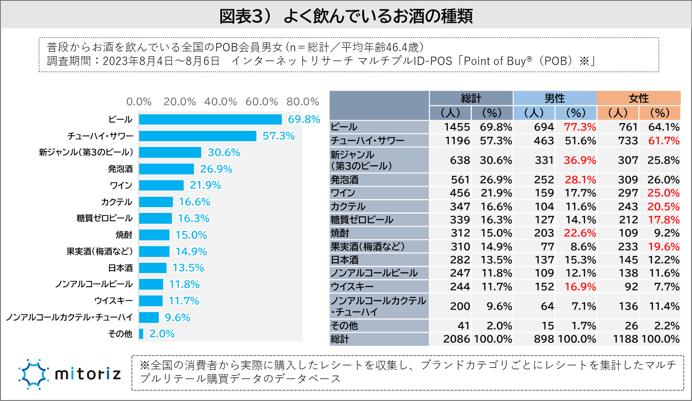 男性は「ビール」「新ジャンル」「発泡酒」のビール類、「焼酎」「ウイスキー」の飲用率が高く、女性は「チューハイ」「ワイン」「カクテル」「果実酒」などの飲みやすいお酒を好む傾向が出ています。また、ビール類は男性の飲用率が高いものの「糖質ゼロビール」は女性の飲用率が高く、男性よりカロリーや糖質を気にしてお酒を選んでいることがわかります(図表3)。