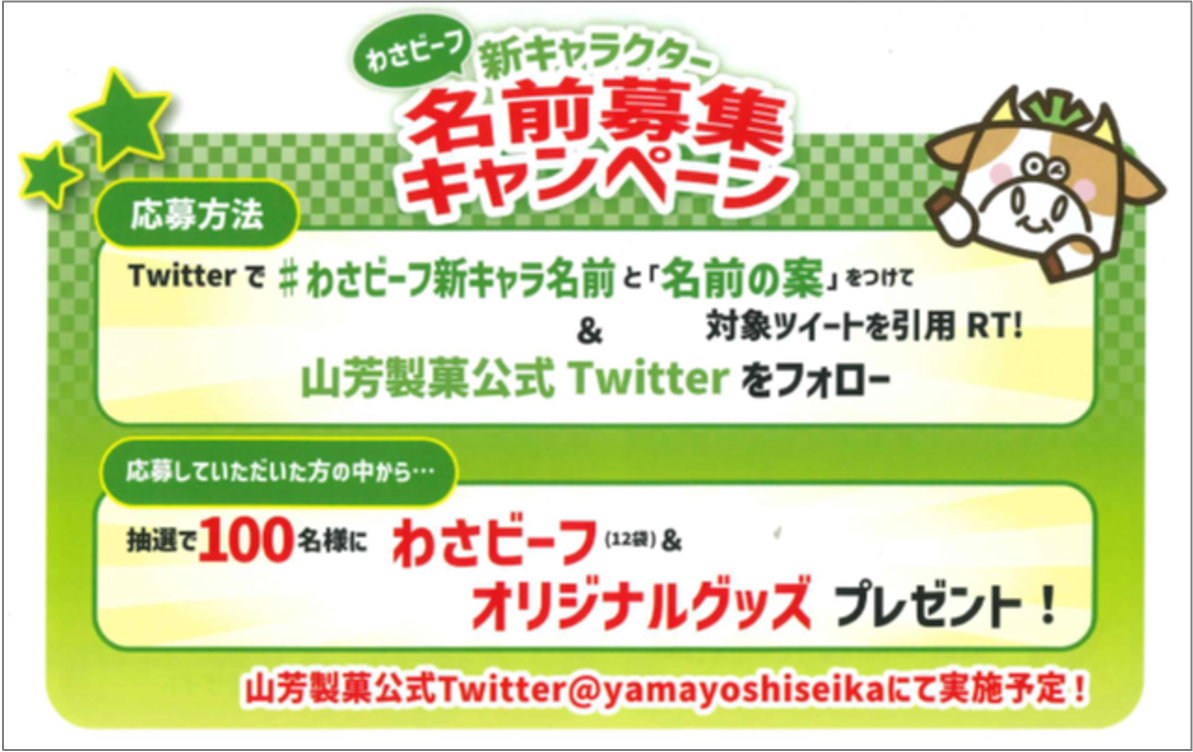 そして「山芳製菓/わさビーフ」の魅力を従業員一同が改めて考えた新キャラクターの名前をお客様から公募することで、皆様に知っていただき新しい山芳製菓の象徴になると考え今回のキャンペーンの実施に至りました。