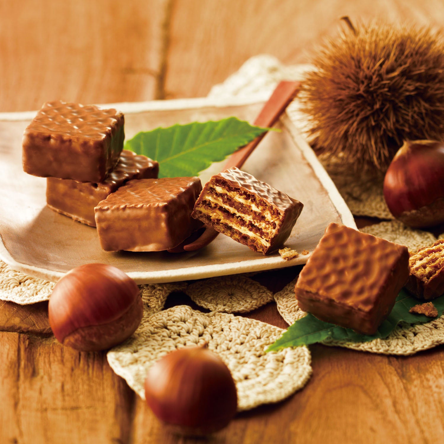栗の風味が豊かに広がるリッチな味わいのモンブランクリームを、4層のウエハースでサンドし、やさしい甘さのチョコレートでコーティングしました。さくさくとした楽しい食感とまろやかな栗のおいしさが重なり合います。