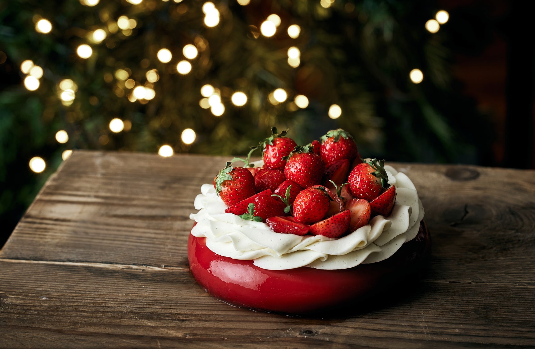 タヒチ産バニラが香るクリームにあまおう苺の赤が映え、クリスマステーブルを華やかに彩ります。ヴィエノワスポンジとストロベリージャムが層をなし、食感のアクセントにはラズベリーサブレをプラス。フルーツの酸味とクリームの優しい甘さをいかし、軽やかでエレガントな一品に仕上げました。