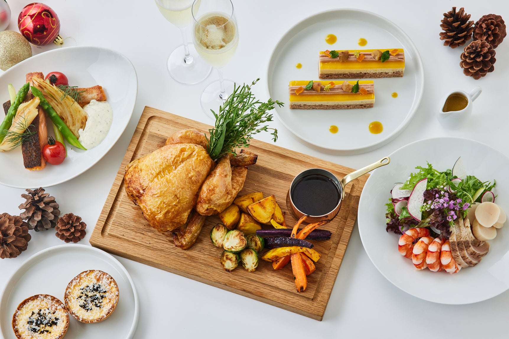 本格的なフルコースをご自宅で手軽にお召し上がりいただけます。シャンパンとも好相性のシーフードサラダに始まり、トリュフが香るキッシュ、ディルクリームと味わうサーモンソテーに続き、メインはレモンタイムが香るローストチキンに季節野菜を添えて。「デリカテッセン」料理長、桑澤剛がご用意するディナーとともに、心に残る聖夜をお過ごしください。
