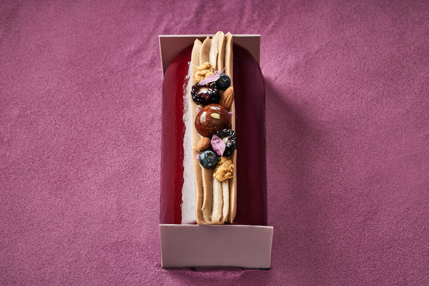 シェフ ジュリアンは今冬、栗とカシスのコンビネーションにトライ。カシスとブルーベリーのゼリーをマロンムースでつつみ、さらにベースとなる生地にも栗を使用しています。濃厚でなめらかな栗の味わいが果実の酸味で際立ち、個性溢れる印象的なテイストに。かすかなアールグレイの風味も爽やかです。