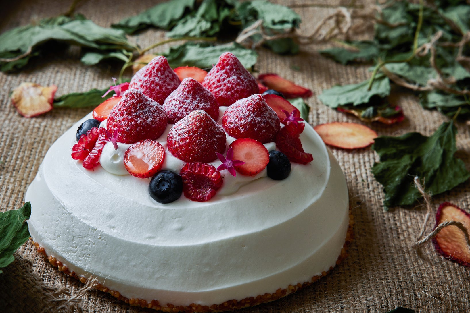 ストロベリージャム、バニラクレモーをあわせたフロマージュブランムースを、鮮やかな苺のグレーズでコーティングし、かすかに柚子の風味も。ドレスのフレアを思わせるクリームデコレーションの愛らしいデザインは、ご家族やご友人が集うデザートタイムにも最適です。