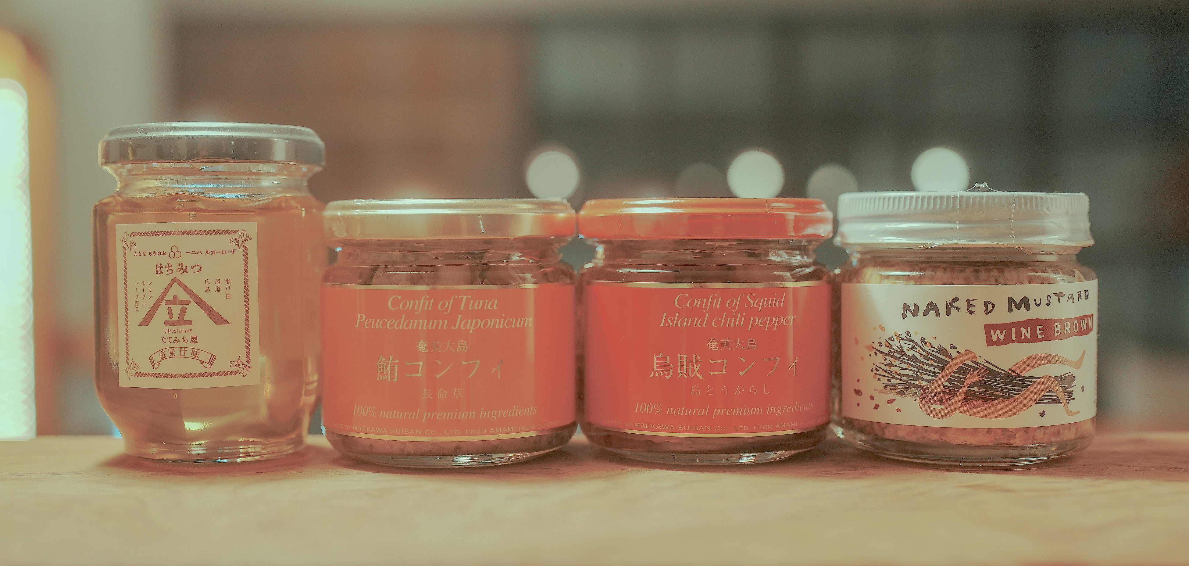 こちらは、左から、広島県たてみち屋様のレモン蜂蜜、奄美大島の前川水産様より、「マグロのリエット」と「烏賊コンフィ」、芥子屋四郎様の「NAKED MUSTARD」。