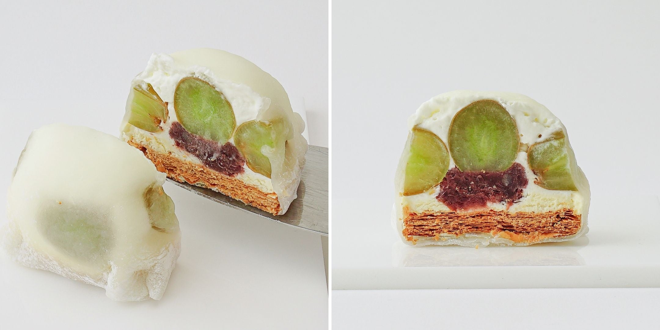 パリッサクッとした食感のミルフィーユを大福にアレンジ。季節限定シャインマスカットバージョンです。