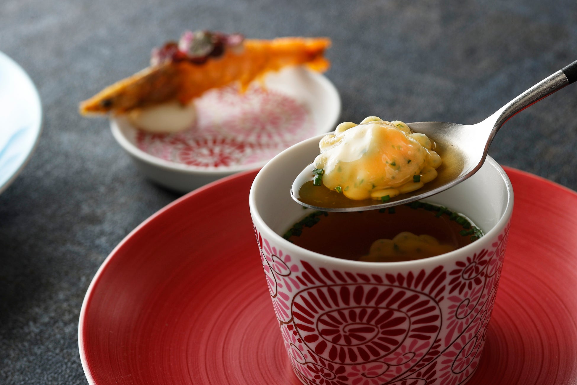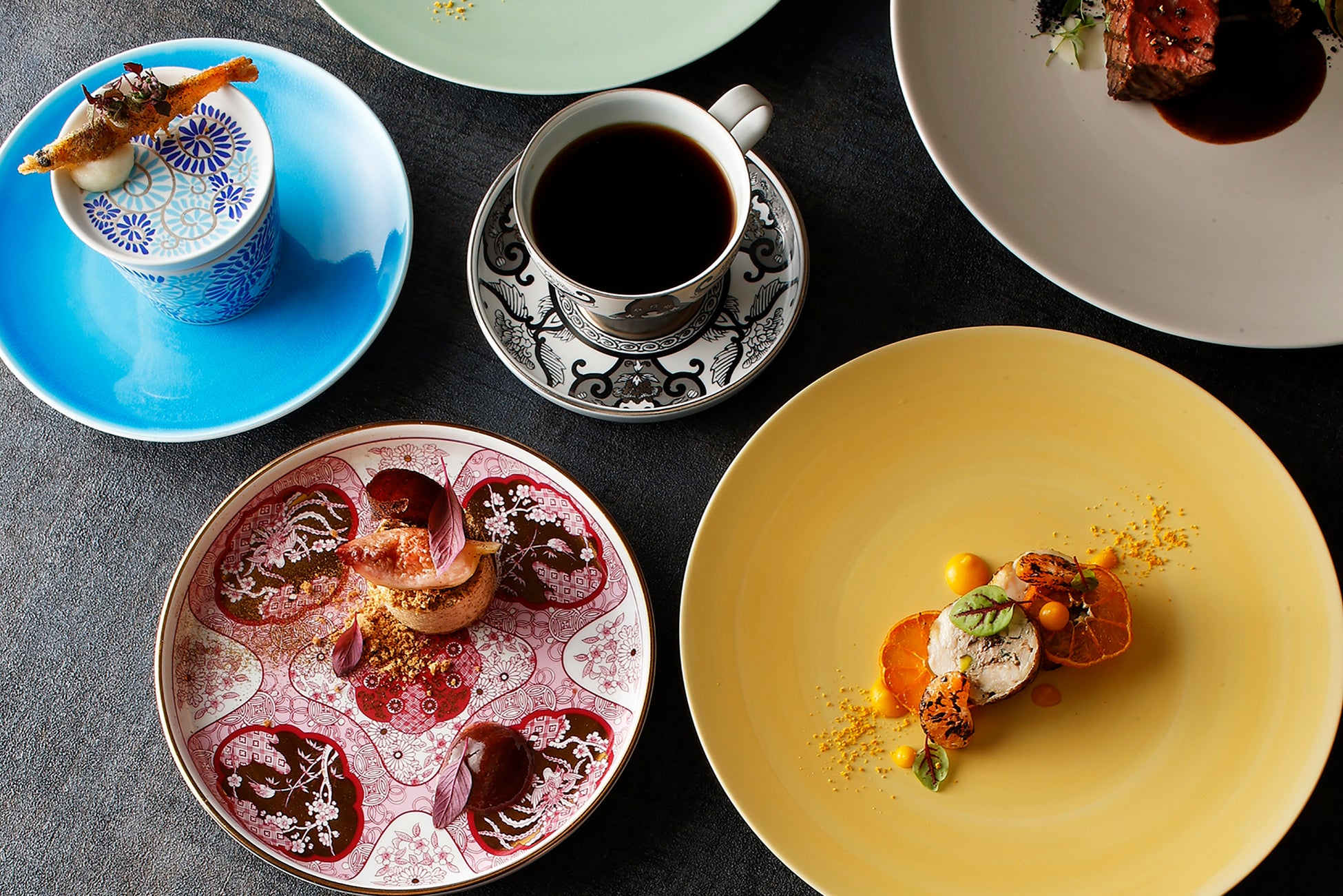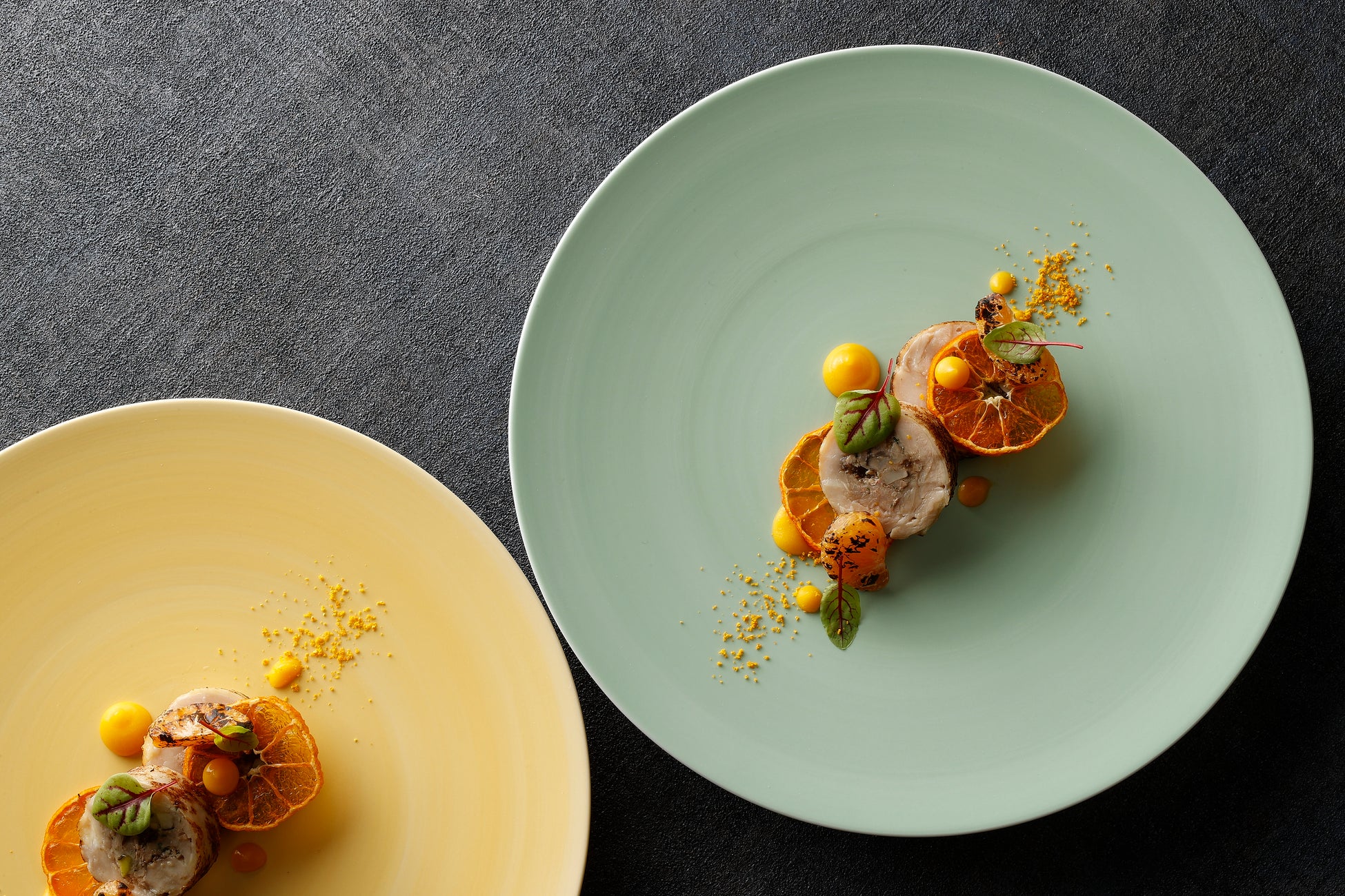 「器で愉しむ秋の美食」をテーマに、New American Grill “KANADE TERRACE”では、アリタポーセリンラボの器に合わせて料理長・多田知史が考案したコース料理をご提供いたします。多田自らが佐賀県に足を運び、七代目弥左ヱ門・松本哲氏よりアリタポーセリンラボの歴史や伝統、それを新たな形で表現する現代の器などの説明を受け、今回使用する器をセレクト。そこからインスピレーションを得た料理を考案いたしました。合わせる食材には、さが県産品流通デザイン公社協力のもと、現地で味を確かめて仕入れた、玄界灘産呼子のイカや骨太有明鶏などを取り入れ、日本の伝統工芸である佐賀県発のブランド・有田焼と、佐賀県の名産品に、ホテル雅叙園東京ならではのエッセンスを加えた革新的なフランス料理のコースが完成いたしました。