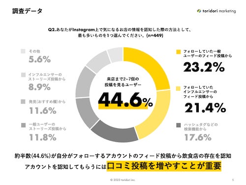 「あなたがInstagram上で気になるお店を認知した際の方法として、最も多いものを1つ選んでください。」という質問に対して、最多回答は「フォローしている一般ユーザーのフィード投稿※から(23.2%)」、次いで「フォローしているインフルエンサーのフィード投稿※から(21.4%)」となり、Instagramのフィード投稿から飲食店アカウントを認知した割合が全体の約半数(44.6%)という結果となりました。