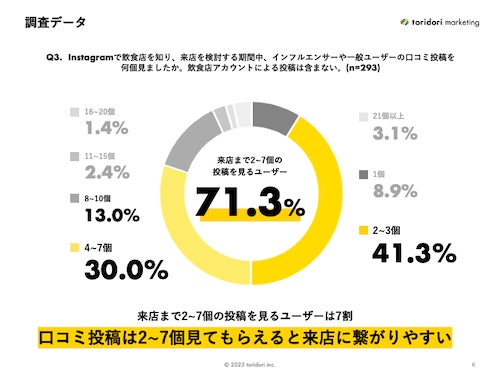 また、「Instagramで飲食店を知り、来店を検討する期間中、インフルエンサーや一般ユーザーの口コミ投稿を何個見ましたか。」という質問に対しては、ユーザーの7割以上(71.3%)が来店検討期間中に口コミ投稿を2~7個見ているということが判明しました。