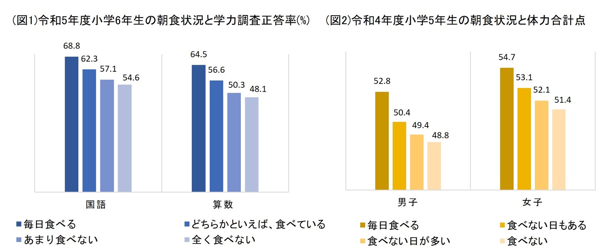 文部科学省・令和5年度「全国学力・学習状況調査」、スポーツ庁・令和4年度「体力・運動能力調査」の結果によると、朝ごはんを毎日食べる習慣のある子どもは、学力調査正答率(図1)や体力合計点(図2)が高い傾向にあることが示されています。2)3)