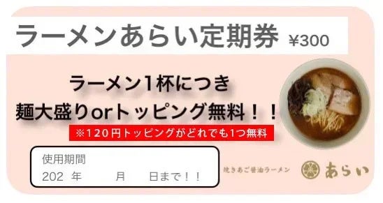 【焼きあご醤油ラーメンあらい】ではラーメン1杯につき麺大盛りorトッピング無料になるお得な定期券を販売しております!