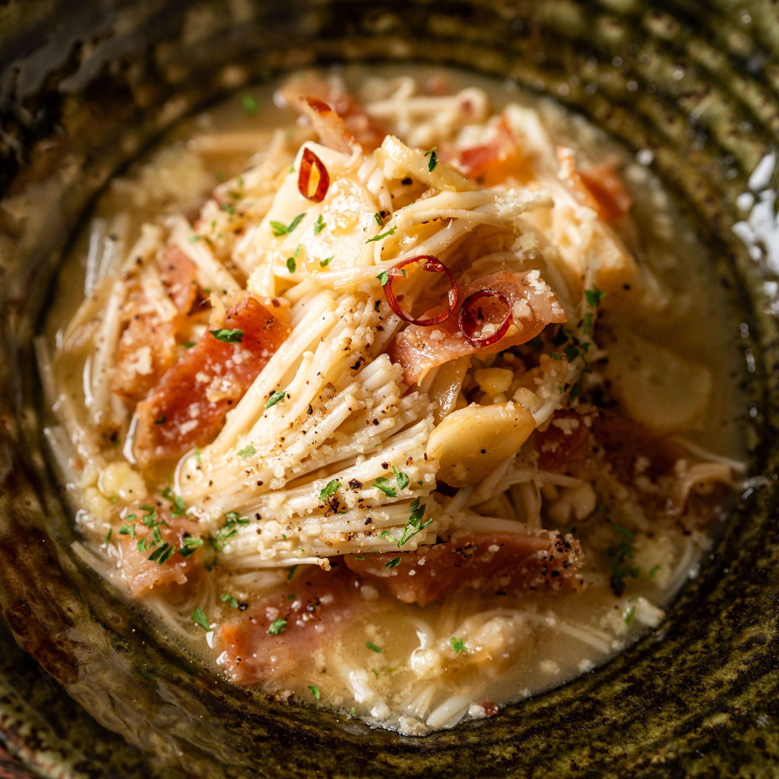 好相性食材、ベーコンとクリームで味わうえのきのステーキです。