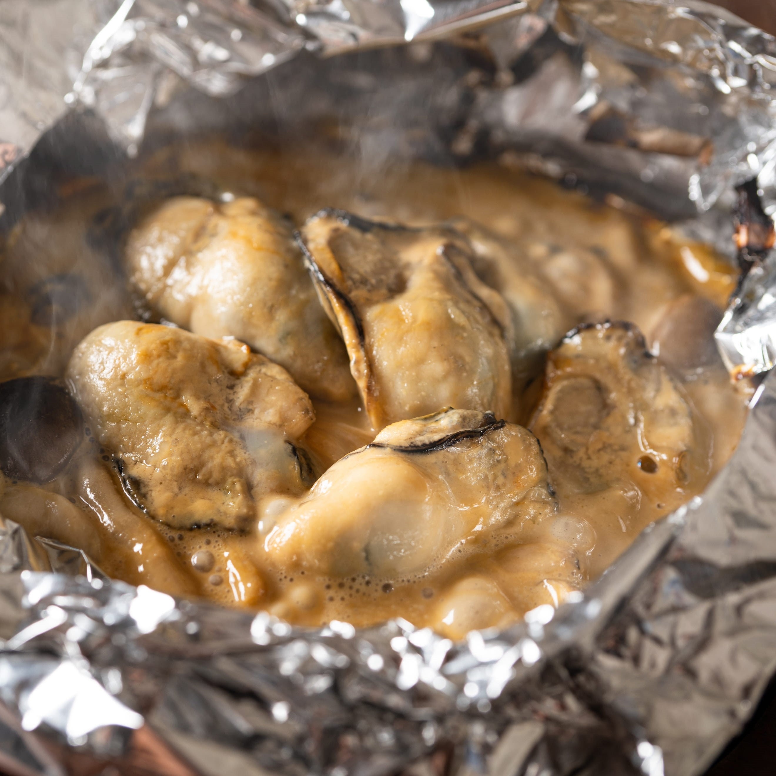広島県産の真牡蠣を、えのき入りの特製イカわたソースに絡めてホイル焼きした一品です。