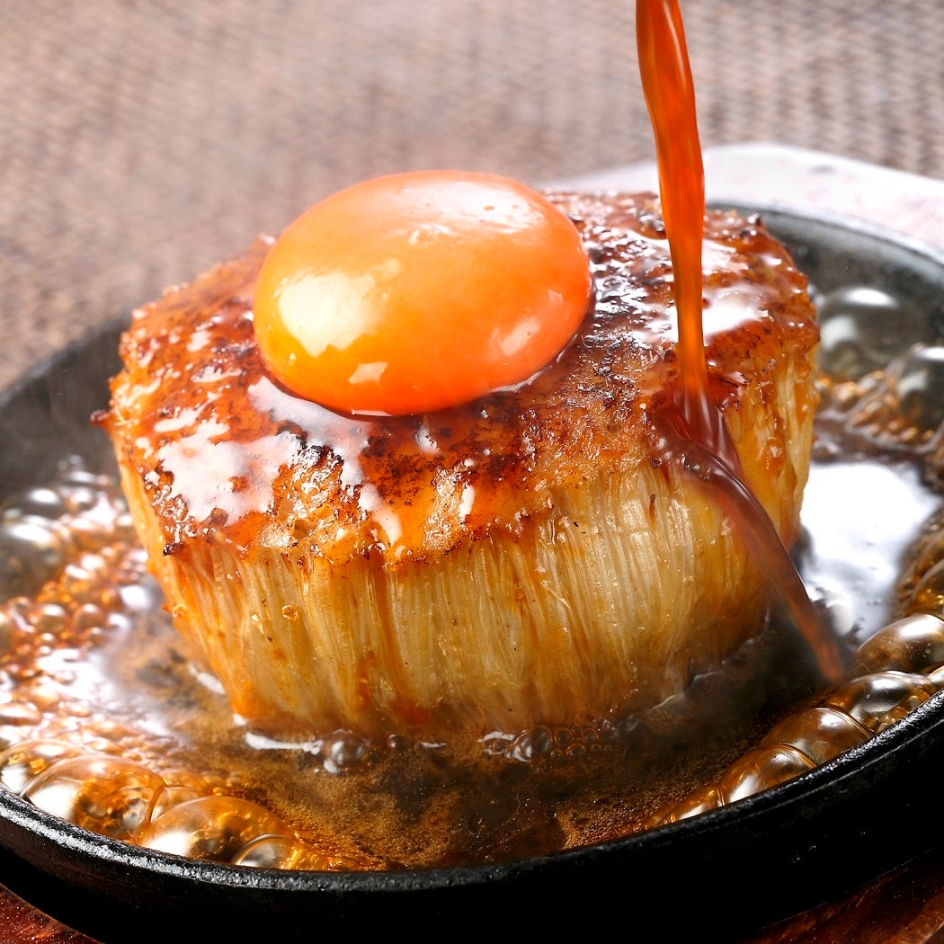 生産時の形そのままに、えのきの株元が持つ強い歯ざわりや風味を丸ごと味わうことができます。切り口に塗って焼く地鶏のつくねと塚だまの濃い黄身のうまみ、さらに熱い鉄板の上で焼けて行くタレで食べ応えも十分です。