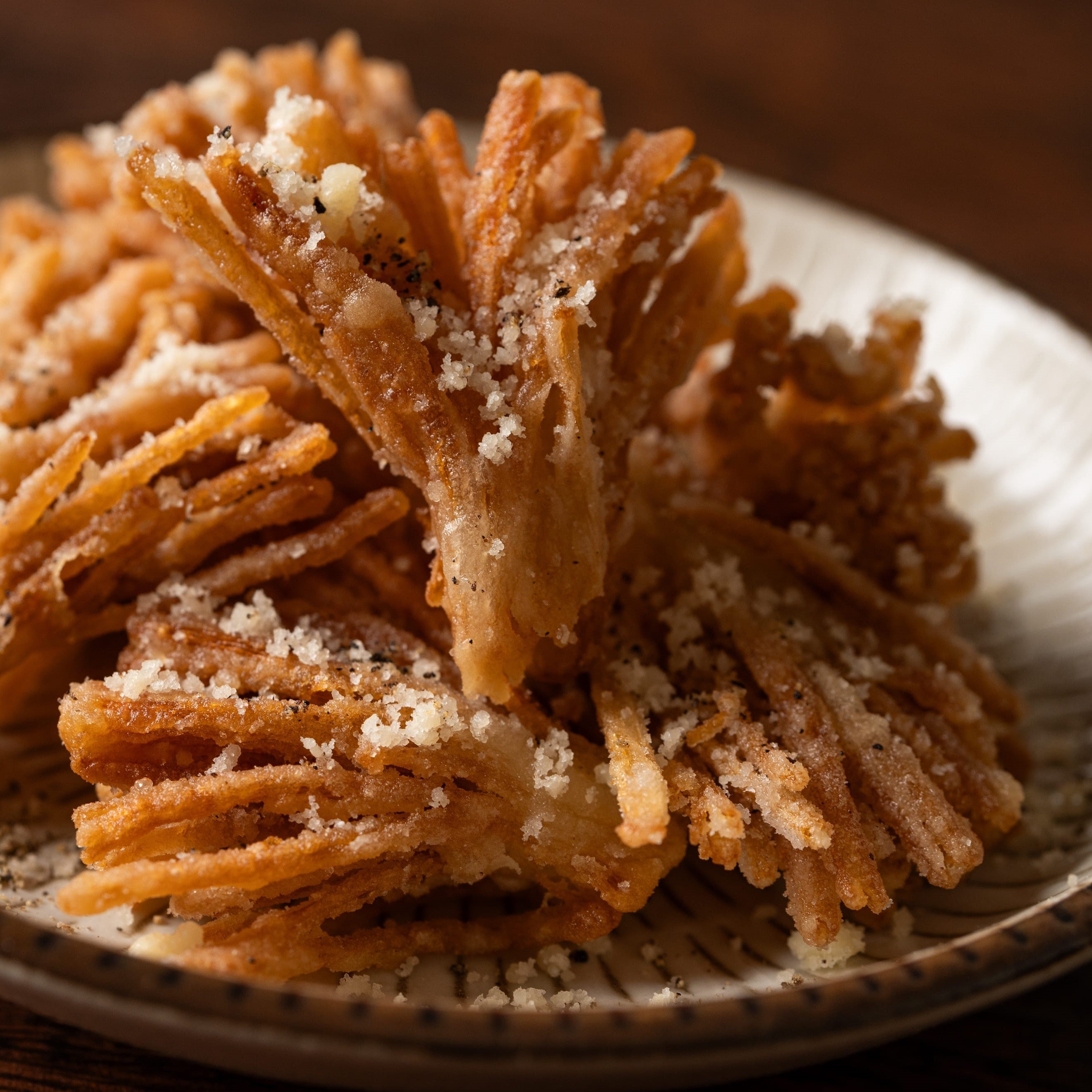 ほぐしたえのきの株元を、サクサク・クリスピーに揚げました。