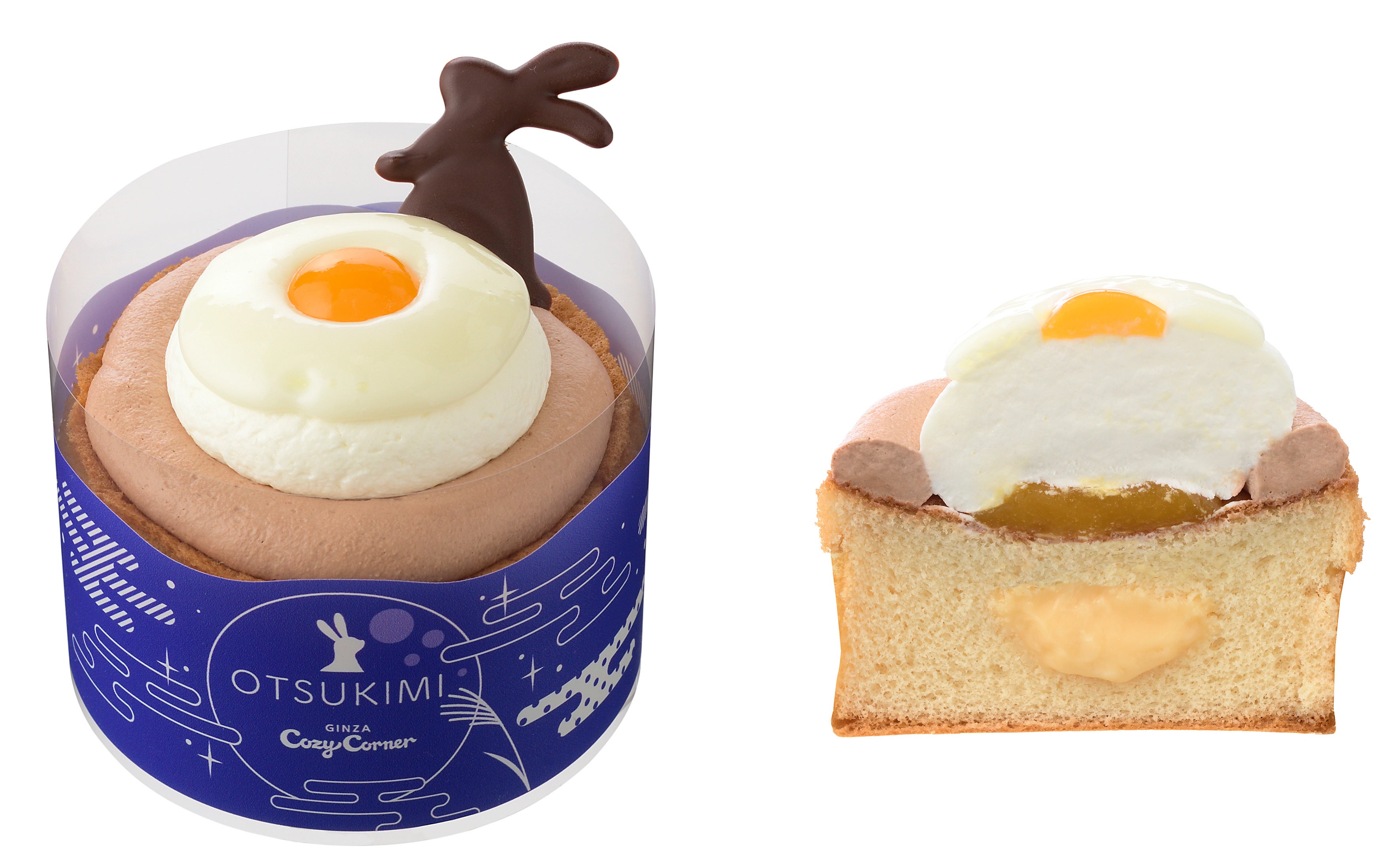 特長:十五夜にちなんで、うさぎとお月様をイメージしたシフォンケーキです。うさぎはチョコレート、お月様はミルキーな練乳風味クリームにマンゴーゼリーをのせて表現。土台はふわふわのシフォンケーキで、中にはなめらかカスタードを忍ばせ、上面にチョコクリームを絞りました。ぜひ、お月様を眺めながらご賞味ください。