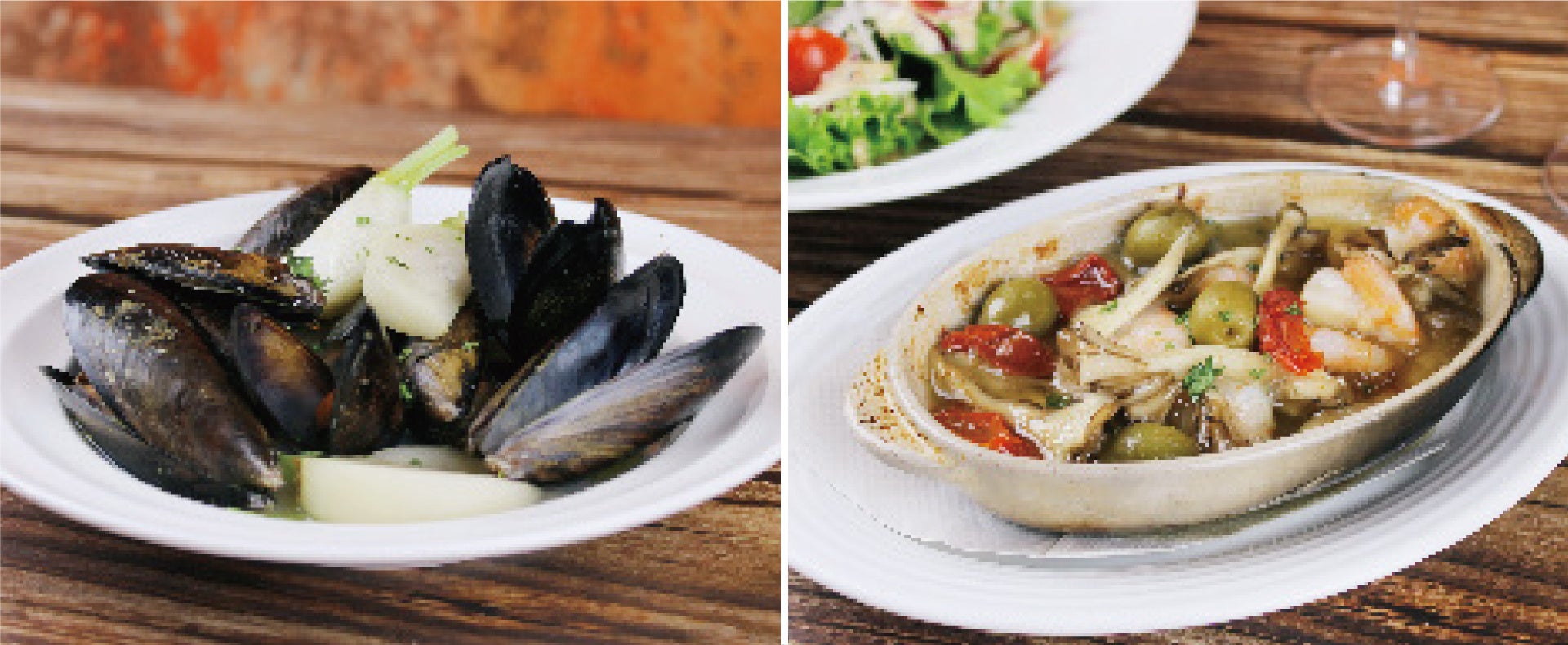 (左)ムール貝のワイン蒸し 714円(税込)