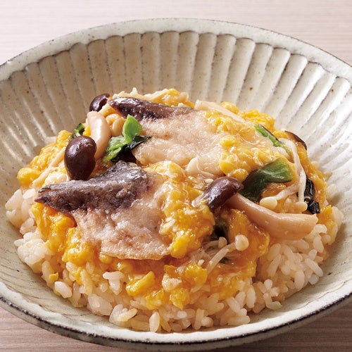 濃厚な旨味を湛える国産の鰤を、カラリと揚げて美味しさを高めた後、薄味でさっと炊き上げたぶなしめじやえのき茸と合わせました。卵でふんわり優しくとじた、秋の風味が存分に愉しめる贅沢なご飯です。