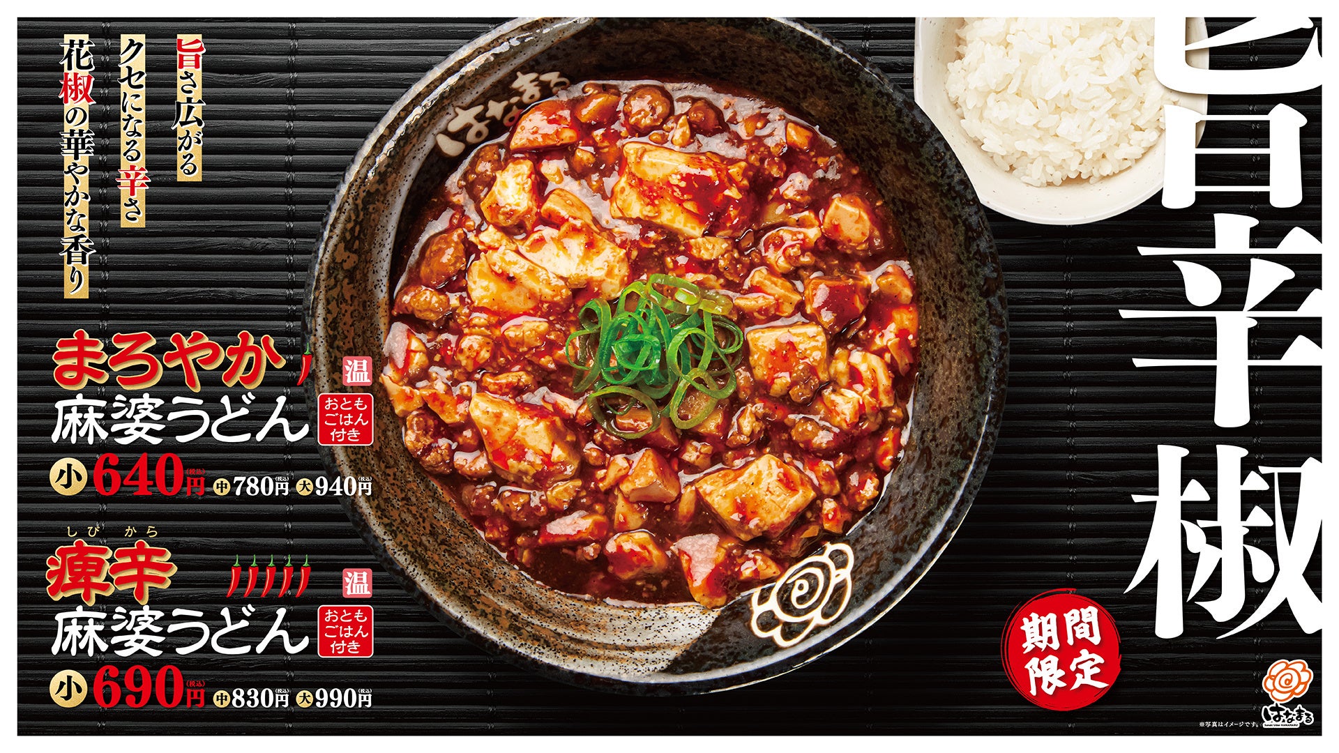 広がる旨さ、クセになる辛さ、花椒の華やかな香りが特徴の麻婆豆腐をかけたまぜうどん2種を期間限定新発売!