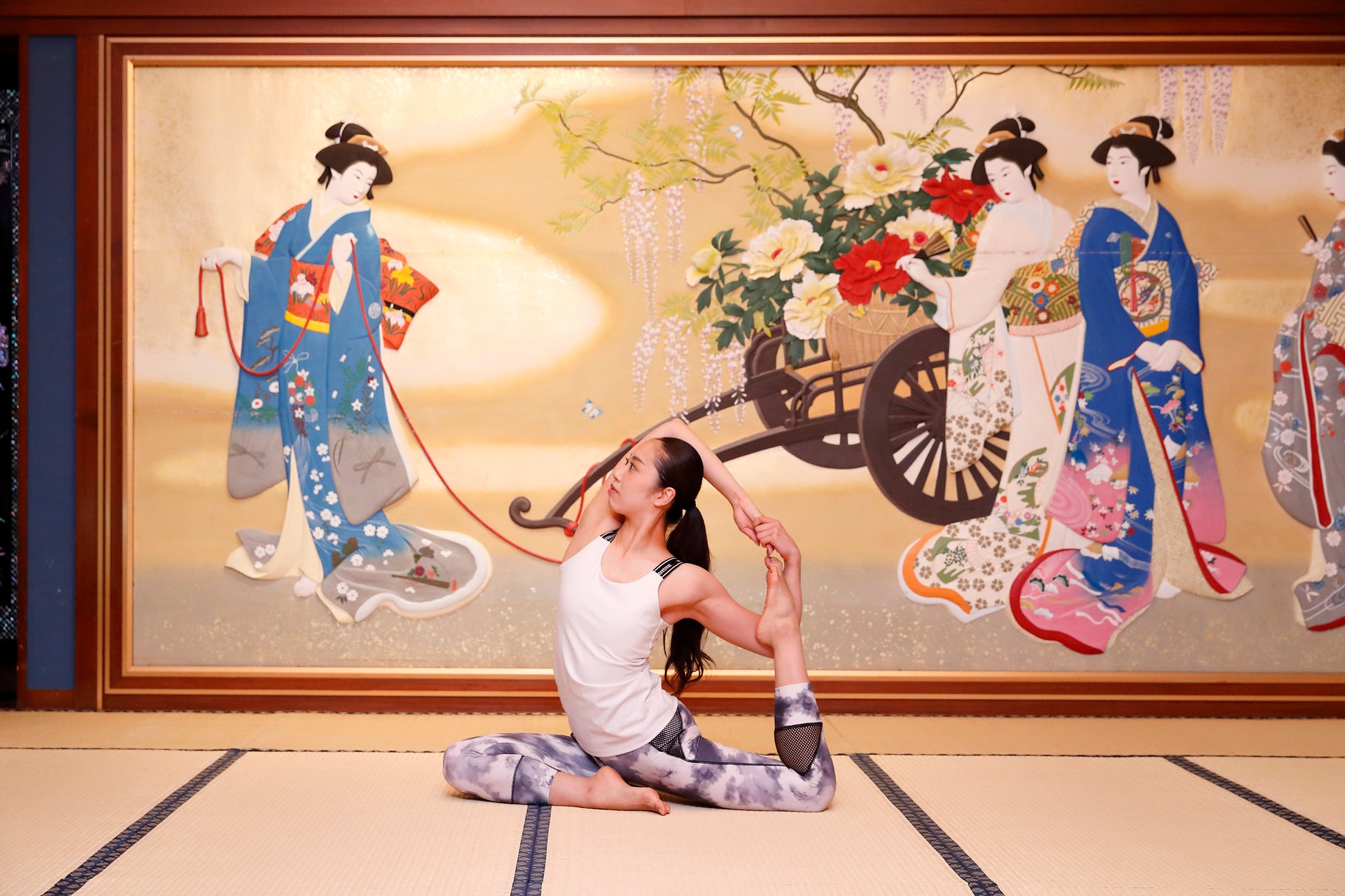 日本画や彩色木彫板、組子障子、螺鈿(らでん)細工など、200点を超える美術品に囲まれた空間でヨガレッスンを行います。