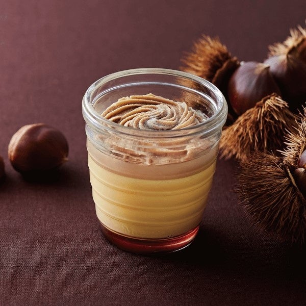 人気のカスタードプリンに、栗の王様ともいわれる利平栗の甘みと食感をのこしたマロンクリームをたっぷりと絞りました。