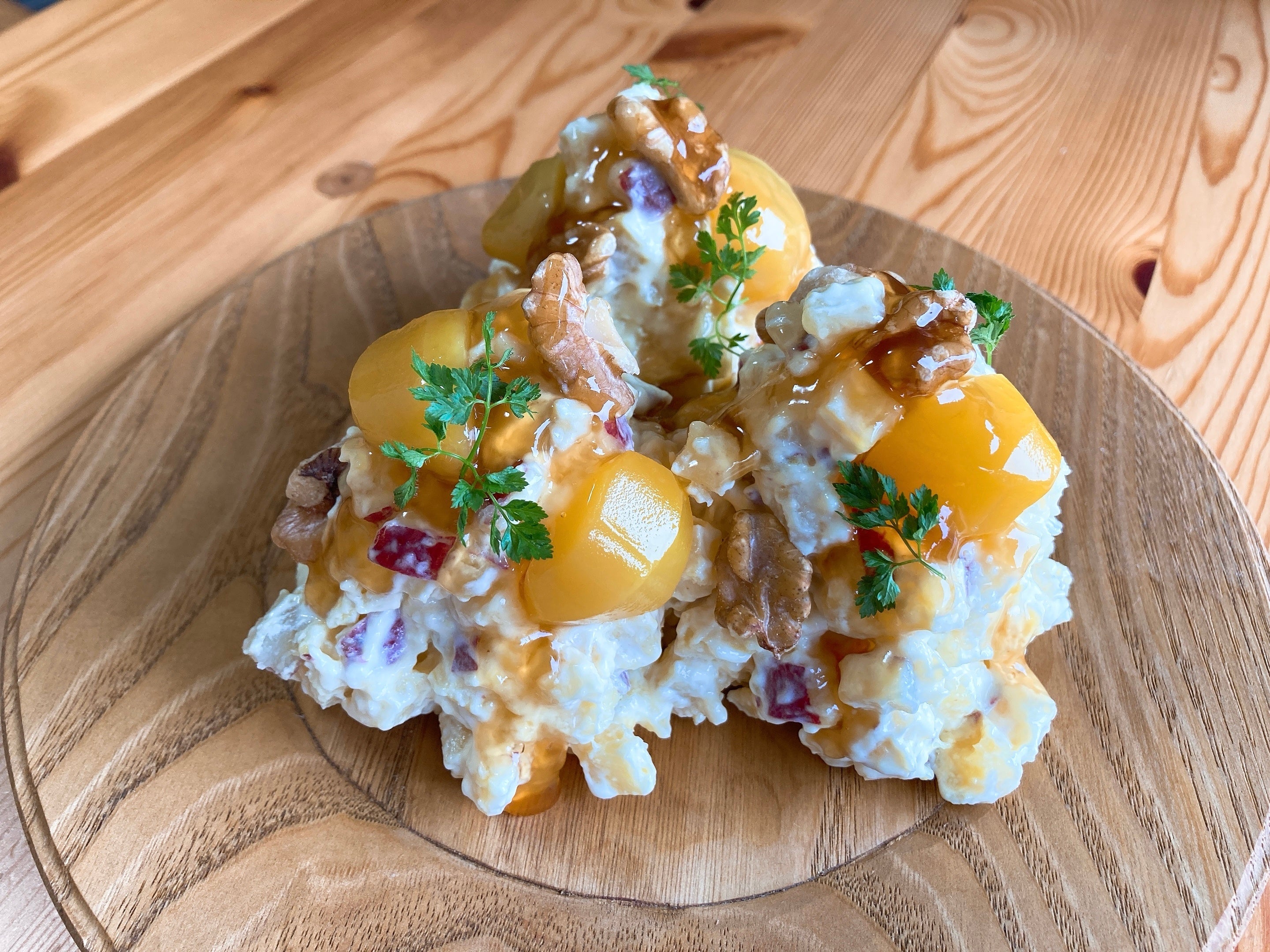 さつまいもサラダに栗やくるみをトッピングした、豊かな食感と香り。黒糖風味のソースをかけました。