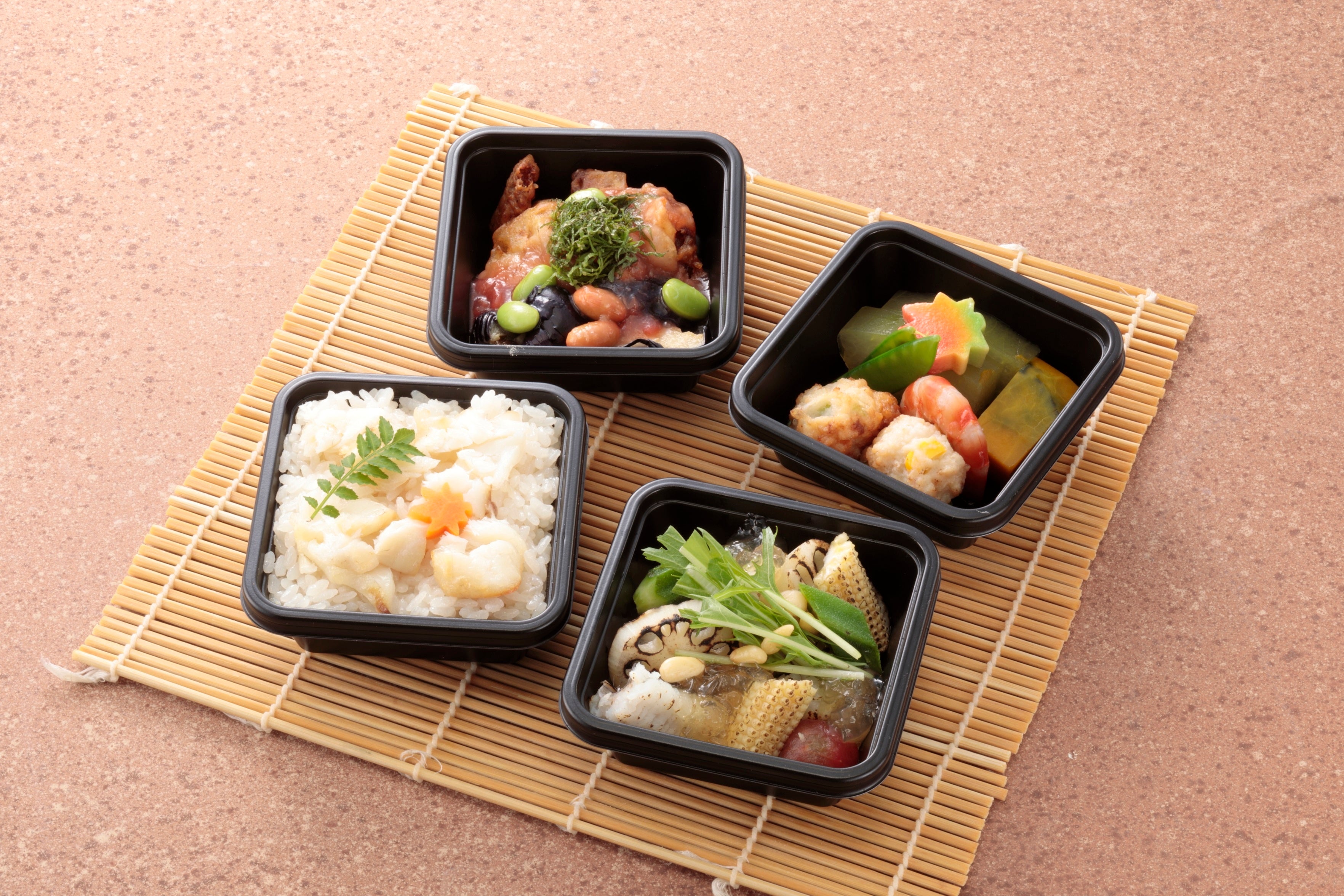 京都の名店の秋の味覚があれこれ。どれも同じ容器に入って いるので、モザイク模様のように自由に組み合わせて、自分好みのカスタム折詰にできます。