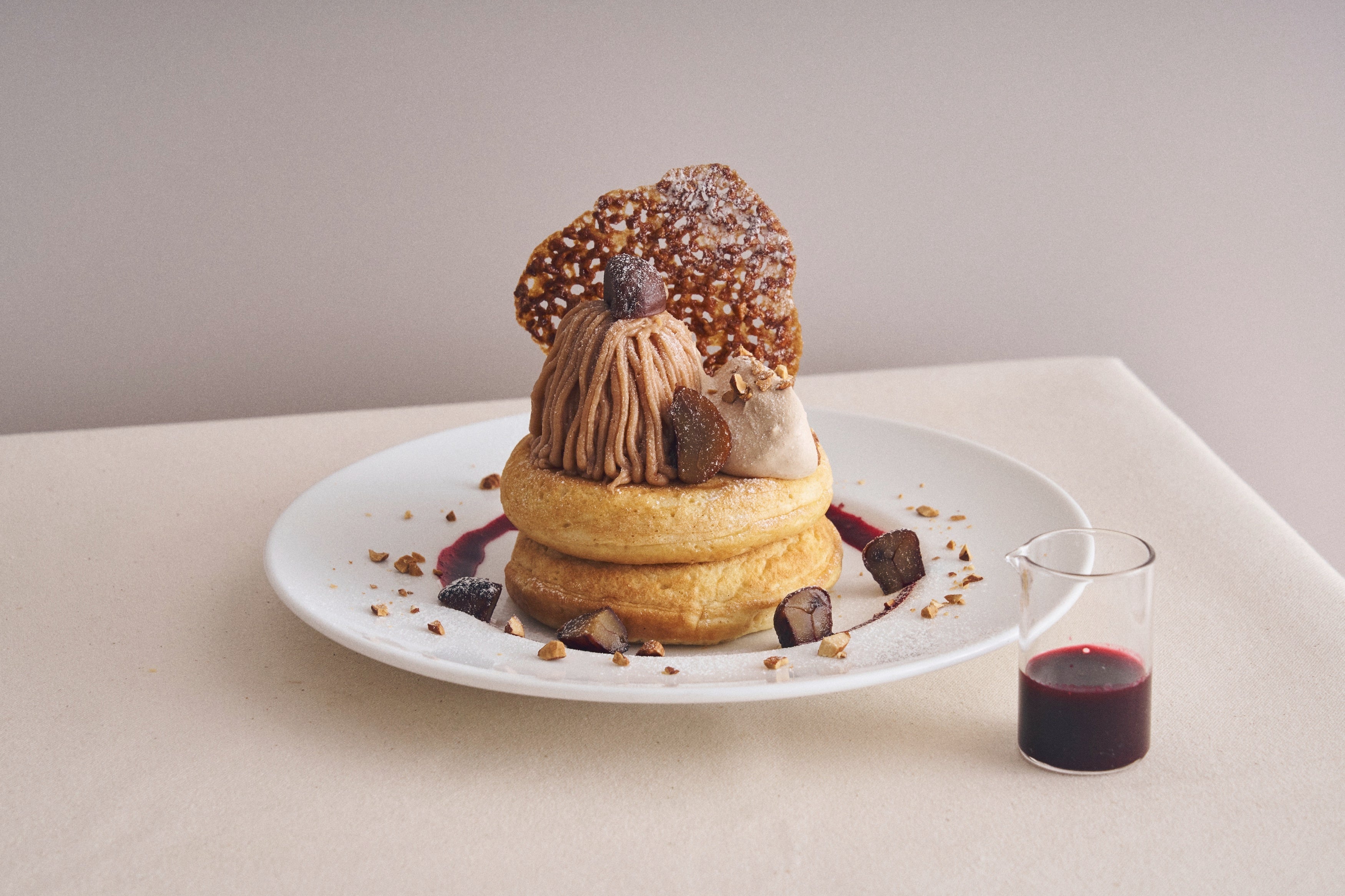 ラム酒を加えたちょっぴり大人なフランス産モンブランクリームと、風味豊かなプラリネクリームを贅沢にトッピングした、秋の味覚たっぷりのパンケーキ。モンブランクリームの芳醇な甘さとカシスソースの酸味がそれぞれの良さを引き立てます。