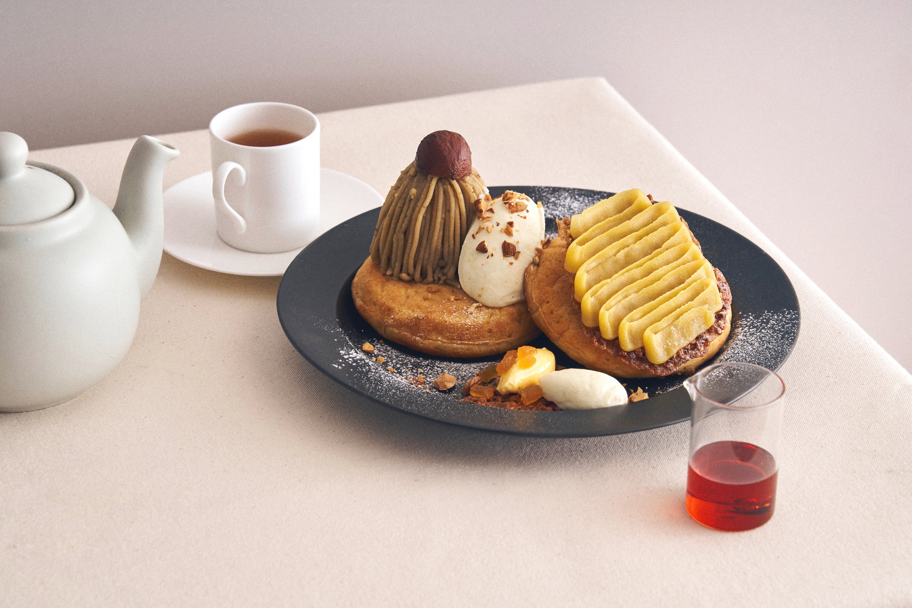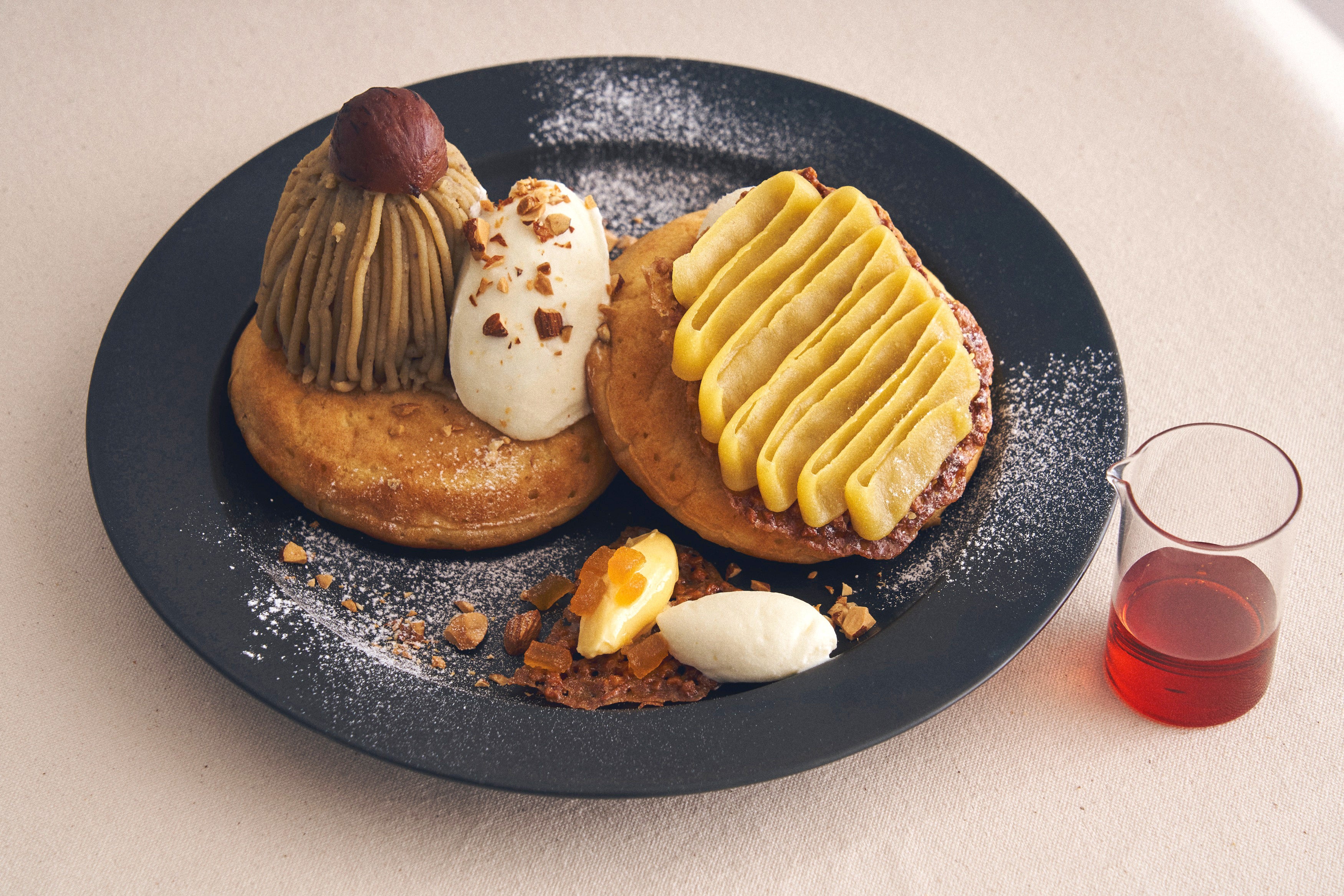 ひとつで2度おいしい!「和栗モンブラン」と「安納芋モンブラン」、2つの味を楽しめる贅沢なパンケーキ。