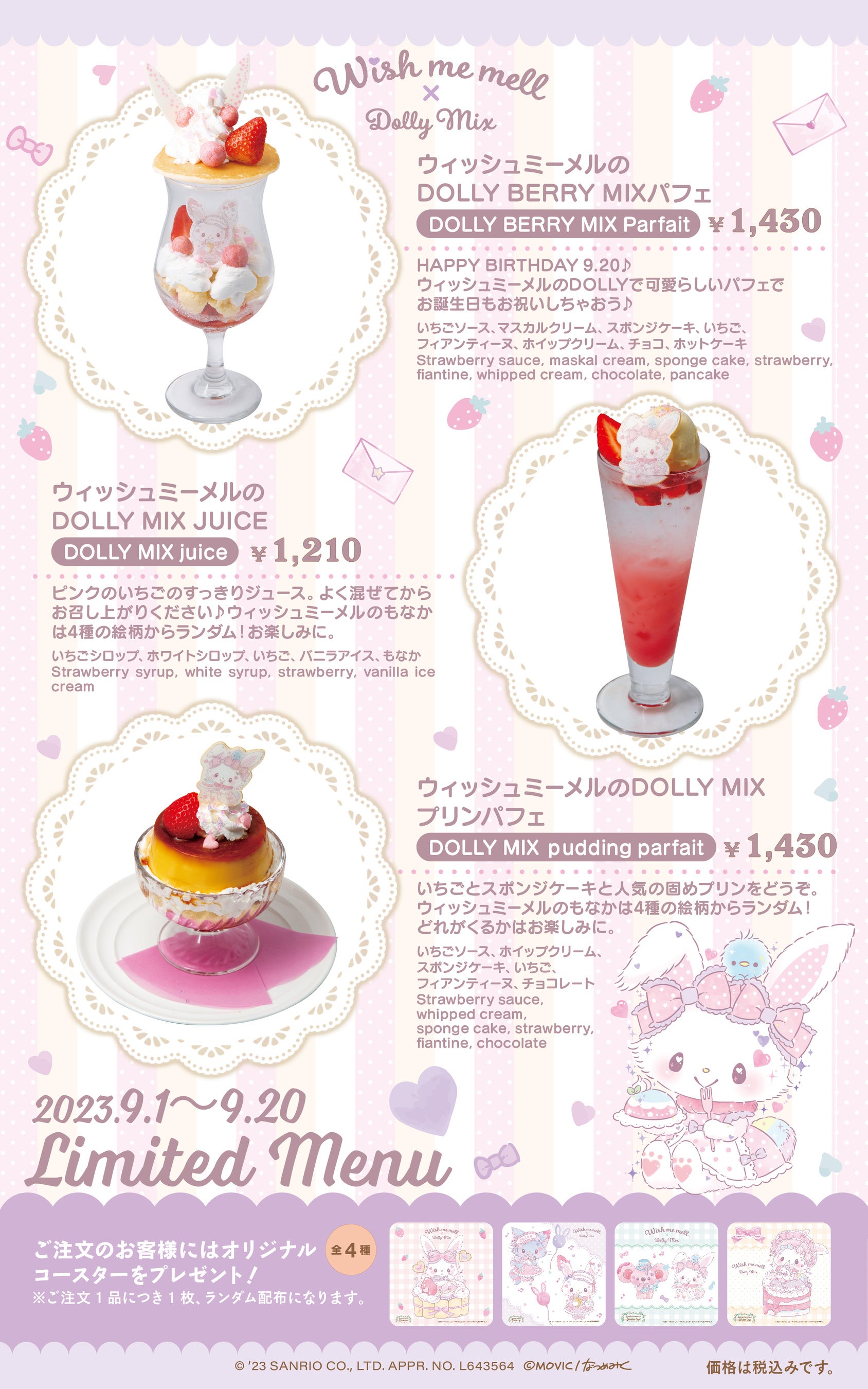 株式会社サンリオのウィッシュミーメルのお誕生日(9/20)を記念して、サンリオキャラクターズ ガーデンカフェにて「ウィッシュミーメル×DOLLY MIX(どーりーみっくす)」をイメージしたオリジナルメニューが登場!メニューをご注文いただくと、もれなく当コラボ限定オリジナルコースターがついてきます♪(全4種ランダム)