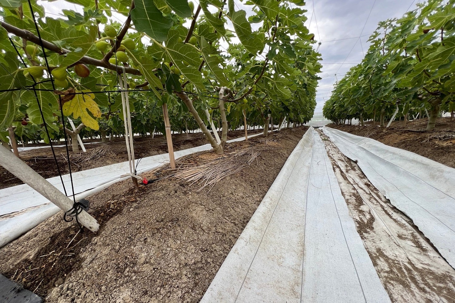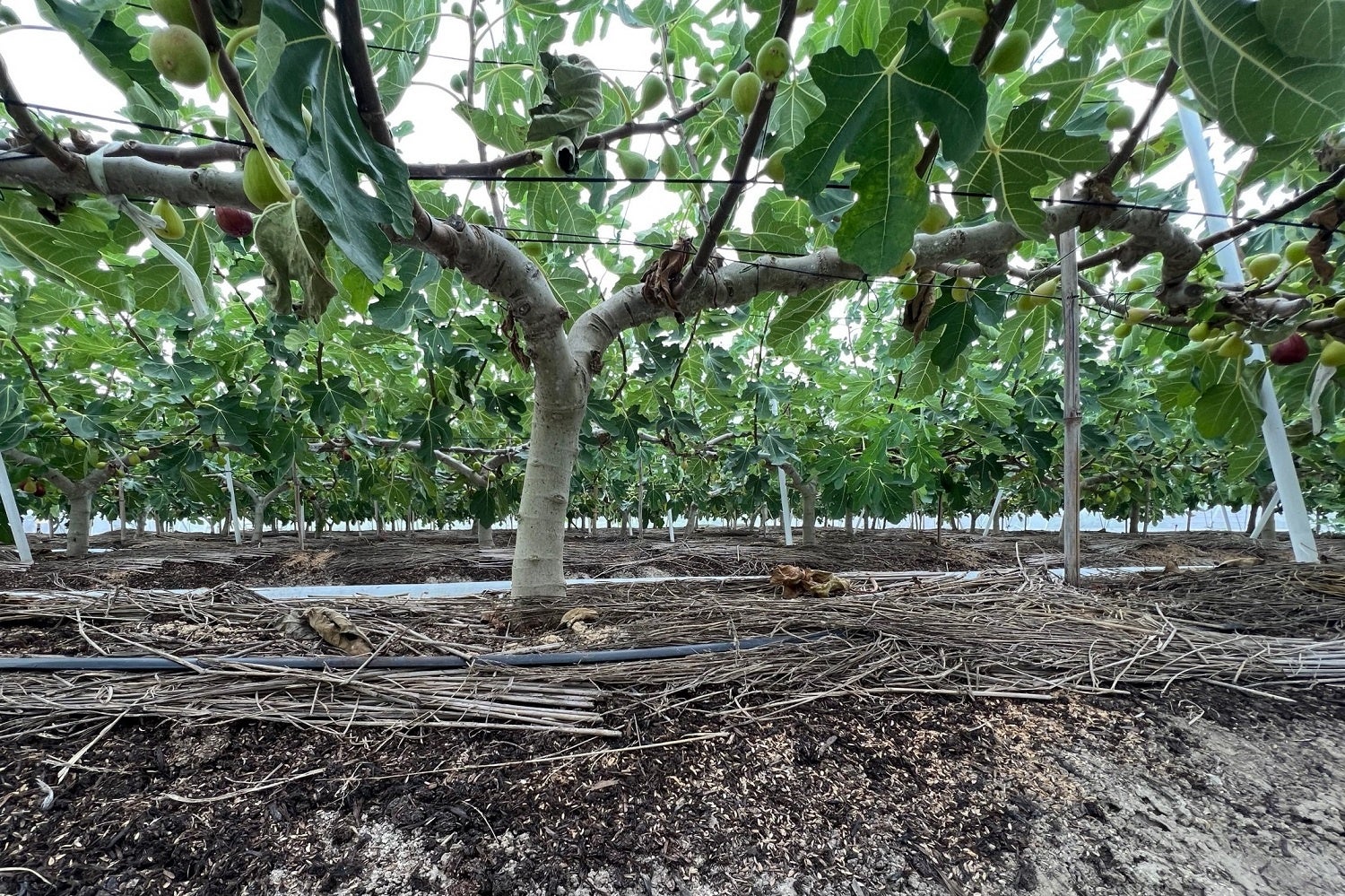 うね幅を通常の圃場より広く取っており、より多くの太陽光が入るように設計されています。土には白いシートを被せて、下からも反射光が当たるようにして、色づきの良い、甘みの高いいちじくが実ります。