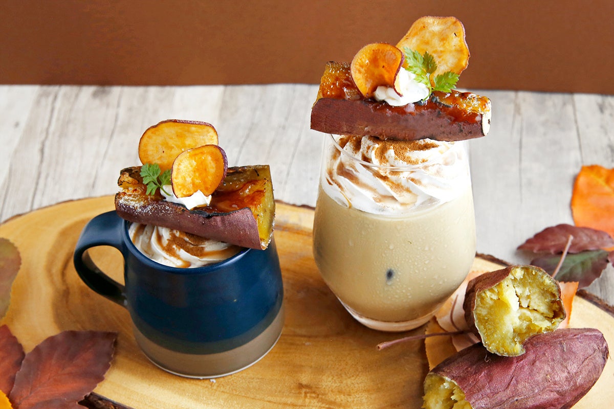 ほうじ茶オーレにキャラメルソースとシナモンパウダーをあわせ、キャラメリゼした焼き芋をトッピングしました。