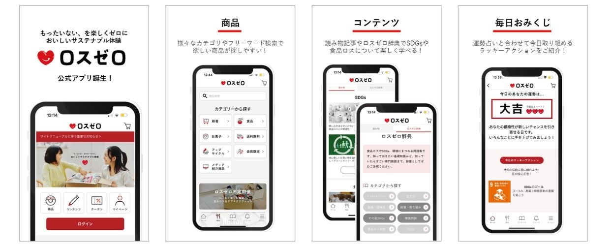 ロスゼロの商品を購入できるだけでなく、「毎日おみくじ」などで遊びながらSDGsに取り組めるコンテンツも充実。読み物でちょっとした知識も学ぶことができるロスゼロの公式アプリ。