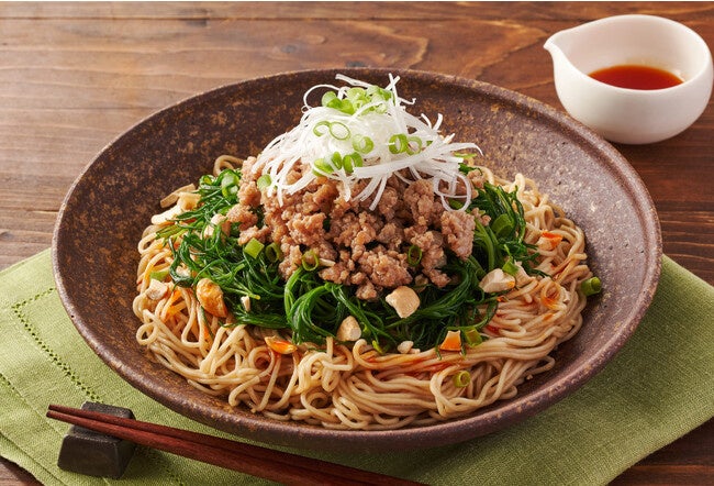 ・商品紹介:広島風の汁なし担々麺に、おかひじきや白髪ねぎをあしらって、Kit Oisixオリジナルの一皿に仕上げました。濃厚なごまだれに、山椒の香り豊かなラー油がよく合います。