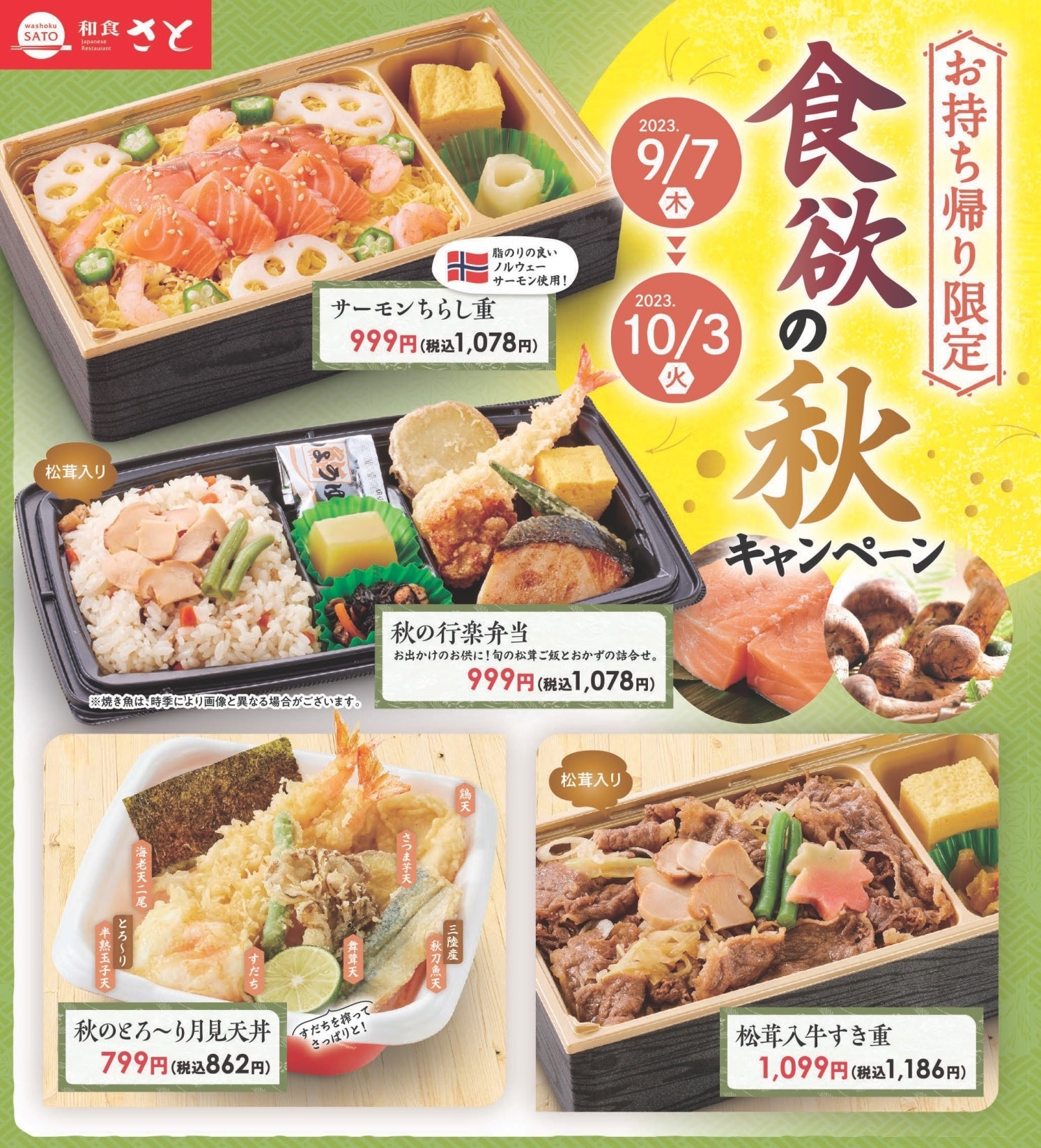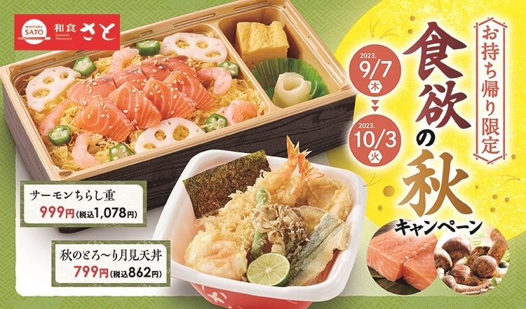 国内197店舗を展開する「和食さと」では、食欲の秋 お持ち帰りキャンペーンと題して、10月3日(火)までの期間限定で秋の味覚たっぷりなテイクアウト商品を販売します。