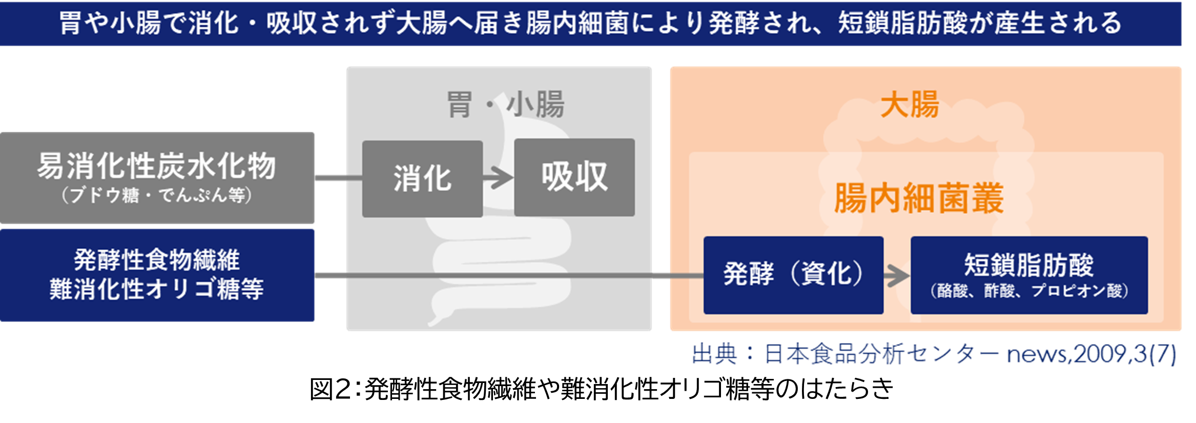 乳清(ホエイ)たんぱく質は、アミノ酸バランスに優れ、体内での消化吸収が速く、同じく良質な窒素源として知られるカゼインや大豆たんぱく質と比較しても、生体内での保持率が高い窒素源です。また、発酵性食物繊維や難消化性オリゴ糖などは、胃や小腸で消化・吸収されず大腸へ届き、腸内細菌により資化され、短鎖脂肪酸が産生されます。